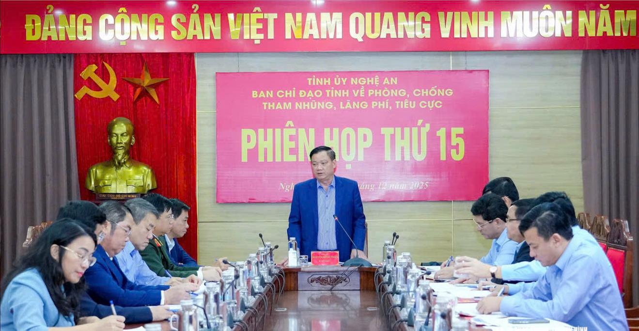Ông Nguyễn Khắc Thận, Bí thư Tỉnh ủy Nghệ An, Trưởng Ban Chỉ đạo tỉnh về phòng, chống tham nhũng, lãng phí, tiêu cực chủ trì phiên họp thứ 15 của Ban Chỉ đạo tỉnh. Phiên họp tập trung đánh giá toàn diện kết quả thực hiện nhiệm vụ quý IV/2025, cho ý kiến đối với một số nội dung thuộc thẩm quyền, đồng thời xác định rõ phương hướng, nhiệm vụ trọng tâm cần tập trung lãnh đạo, chỉ đạo trong quý I/2026.