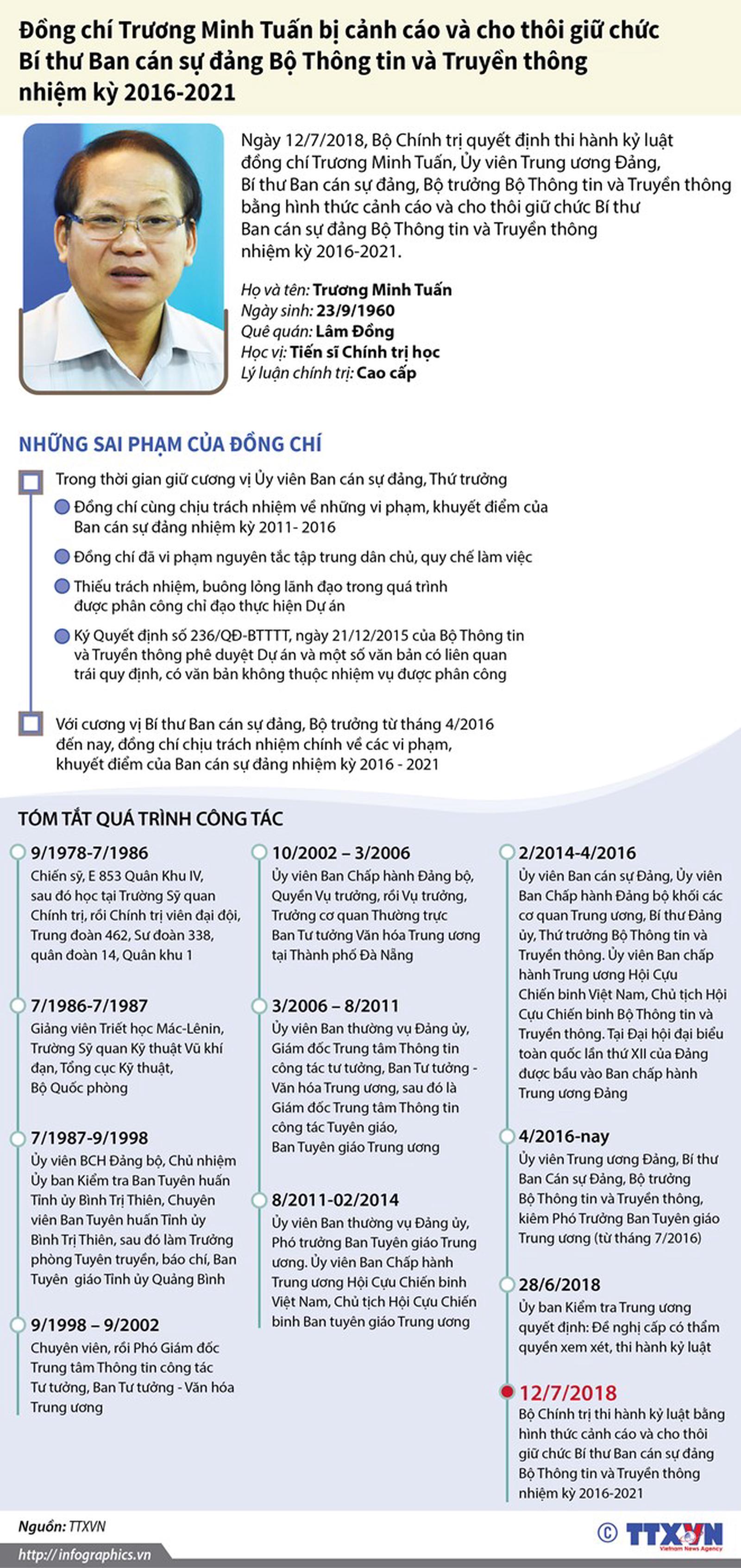Ngày 12/7, Bộ Chính trị quyết định thi hành kỷ luật đồng chí Trương Minh Tuấn, Ủy viên Trung ương Đảng, Bí thư Ban cán sự đảng, Bộ trưởng Bộ Thông tin và Truyền thông bằng hình thức cảnh cáo và cho thôi giữ chức Bí thư Ban cán sự đảng Bộ Thông tin và Truyền thông nhiệm kỳ 2016-2021.