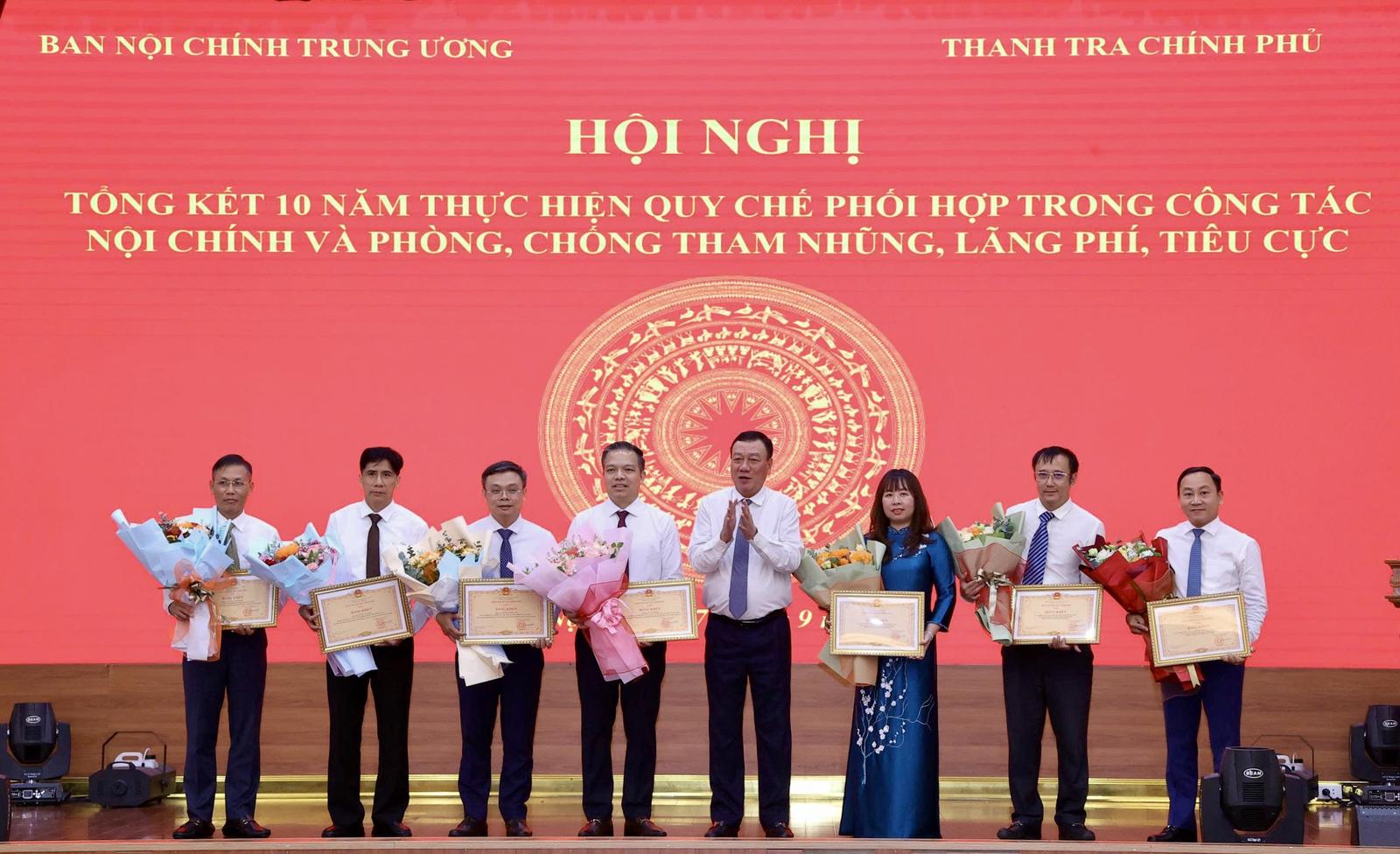 Tổng Thanh tra Chính phủ trao Bằng khen cho bà Trương Thị Hồng Hà, Phó Vụ trưởng Vụ Nghiên cứu tổng hợp, Ban Nội chính Trung ương cùng các cá nhân thuộc Ban Nội chính Trung ương. Ảnh: T.T