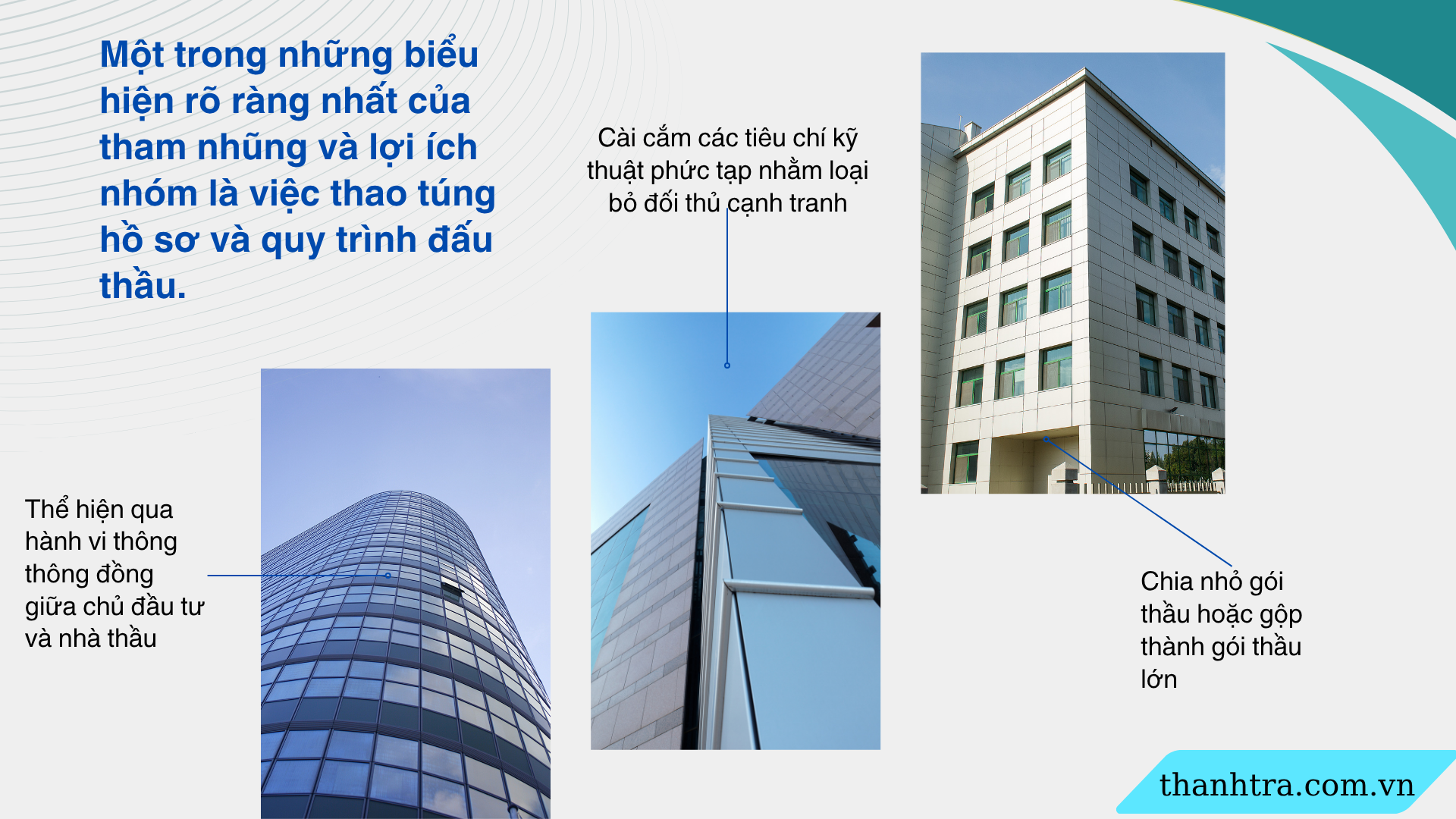 Một trong những biểu hiện rõ ràng nhất của tham nhũng và lợi ích nhóm là việc thao túng hồ sơ và quy trình đấu thầu. Điều này thể hiện qua các hành vi thông đồng giữa chủ đầu tư và nhà thầu. Thông qua các mối quan hệ “sân sau”, thông tin về dự án, tiêu chí đấu thầu, hoặc thậm chí là giá gói thầu có thể bị rò rỉ. Từ đó giúp các nhà thầu như Phúc Sơn và Thuận An có lợi thế vượt trội, dễ dàng trúng thầu mà không cần cạnh tranh một cách công bằng, minh bạch.
