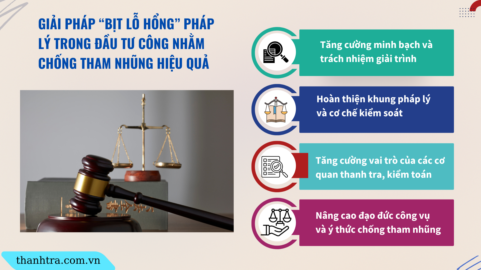 Hoàn thiện khung pháp lý và cơ chế kiểm soát cũng là nội dung quan trọng phòng ngừa tham nhũng trong đầu tư công. Cụ thể, cần siết chặt quy định về đấu thầu. Liên quan đến nội dung này, luật gia Đỗ Văn Nhân đề xuất: “Cần rà soát, sửa đổi các quy định về đấu thầu để loại bỏ những kẽ hở pháp lý, đảm bảo sự cạnh tranh công bằng. Đặc biệt, cần quy định rõ ràng về tiêu chí lựa chọn nhà thầu, tránh các tiêu chí “đo ni đóng giày”.