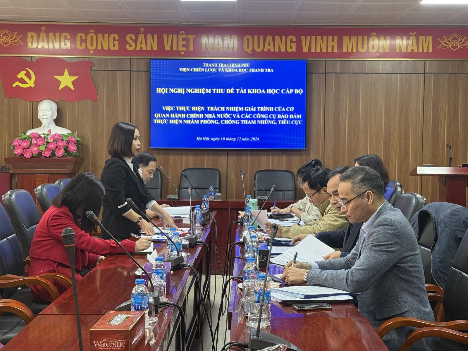 (Thanh tra) - Ngày 16/12, Viện Chiến lược và Khoa học Thanh tra đã tổ chức hội nghị nghiệm thu đề tài khoa học cấp bộ “Việc thực hiện trách nhiệm giải trình của cơ quan hành chính Nhà nước và các công cụ bảo đảm thực hiện nhằm phòng, chống tham nhũng, tiêu cực”, do ThS Phạm Thị Thu Hiền, Phó Hiệu trường Trường Cán bộ Thanh tra làm Chủ nhiệm.