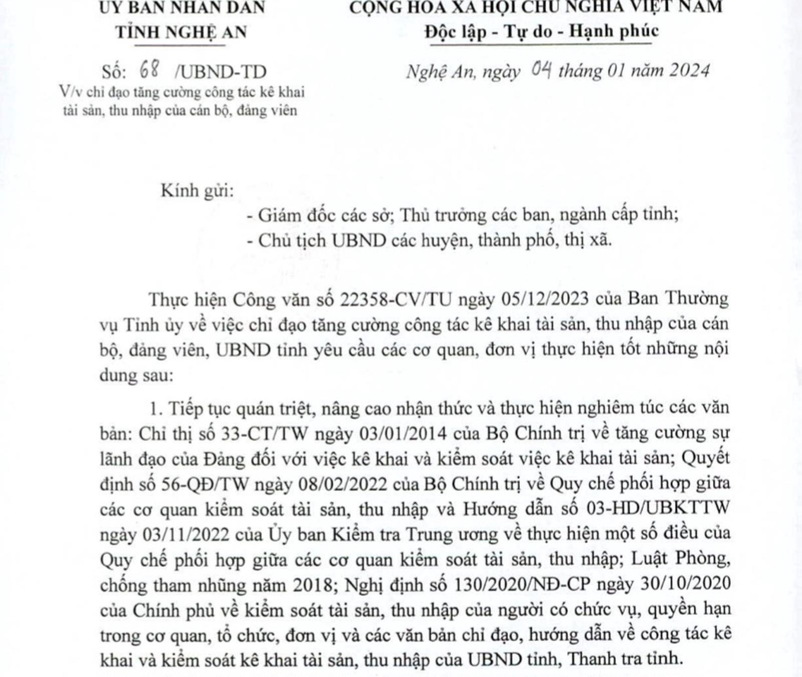 Văn bản chỉ đạo của UBND tỉnh Nghệ An về kê khai tài sản, thu nhập. Ảnh: X.T