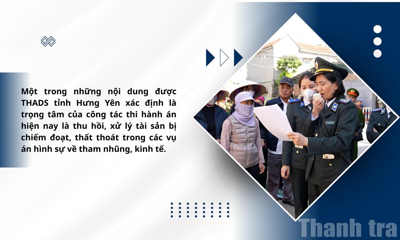 Những con số này cho thấy công tác thu hồi tài sản bị chiếm đoạt thất thoát trong các vụ án hình sự về tham nhũng, kinh tế vẫn còn gặp nhiều khó khăn, đặc biệt là đối với các vụ việc có giá trị tài sản lớn, liên quan đến tín dụng ngân hàng hoặc kéo dài qua nhiều giai đoạn. Tuy nhiên, với quyết tâm chính trị cao và sự chỉ đạo sát sao, THADS tỉnh Hưng Yên tiếp tục xác định đây là nhiệm vụ then chốt, cần tập trung nguồn lực để từng bước tháo gỡ vướng mắc, nâng cao hiệu quả thực chất của công tác thi hành án.