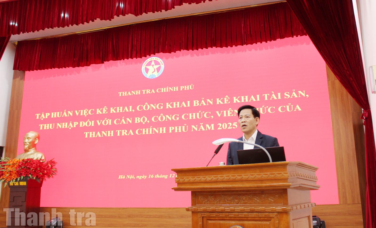 (Thanh tra) - Sáng ngày 16/12, Thanh tra Chính phủ tổ chức hội nghị tập huấn việc kê khai, công khai bản kê khai tài sản, thu nhập năm 2025 cho công chức, viên chức có trách nhiệm kê khai và các đồng chí làm công tác tham mưu, theo dõi, kiểm soát tài sản, thu nhập.