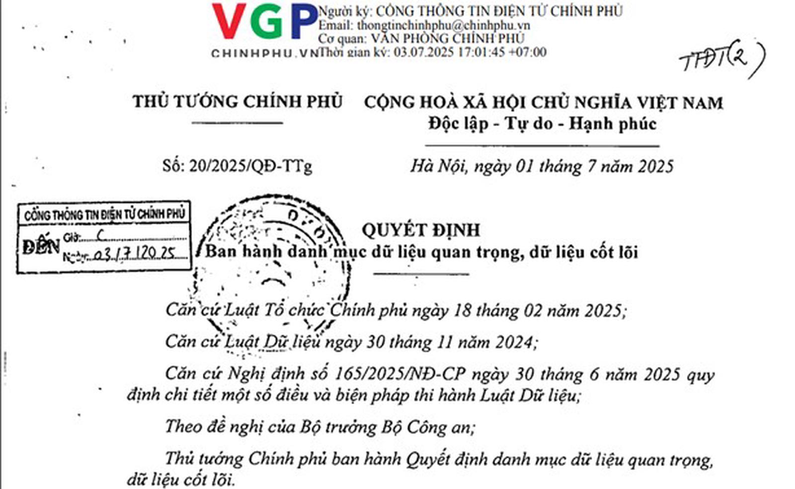 Quyết định số 20/2025/QĐ-TTg do Phó Thủ tướng Nguyễn Chí Dũng ký ngày 1/7/2025, liệt kê danh mục 26 dữ liệu cốt lõi và 43 dữ liệu quan trọng (bao gồm 26 dữ liệu cốt lõi).