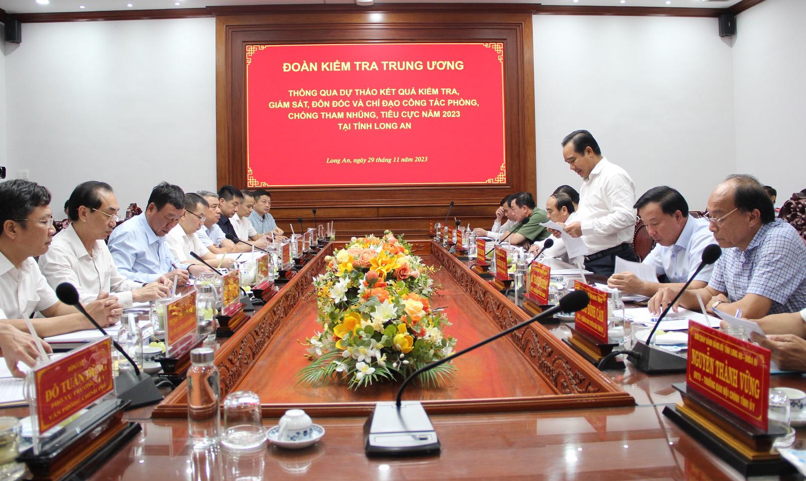 Tại buổi làm việc, Phó Tổng TTCP Đặng Công Huẩn - Phó Trưởng đoàn đã trình bày toàn văn dự thảo kết quả kiểm tra, giám sát, đôn đốc và chỉ đạo công tác PCTN, tiêu cực năm 2023 tại tỉnh Long An.