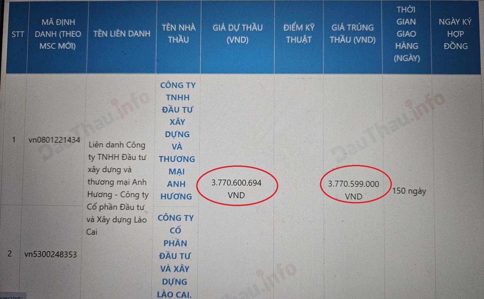 Gói thầu số 1: Thi công xây dựng công trình + nghiệm thu đóng điện bàn giao + đảm bảo an toàn giao thông: Cải tạo, nâng cấp hệ thống lan can, kè sông Hồng (đoạn từ nút giao đường Quy Hóa đến cầu Phố Mới), TP Lào Cai, với giá dự thầu nhà thầu này đưa ra là 3.770.600.694 đồng và giá trúng thầu là 3.770.599.000 đồng, tức là giữa giá bỏ thầu chỉ cao hơn giá trúng có chưa đến 1.700 đồng.