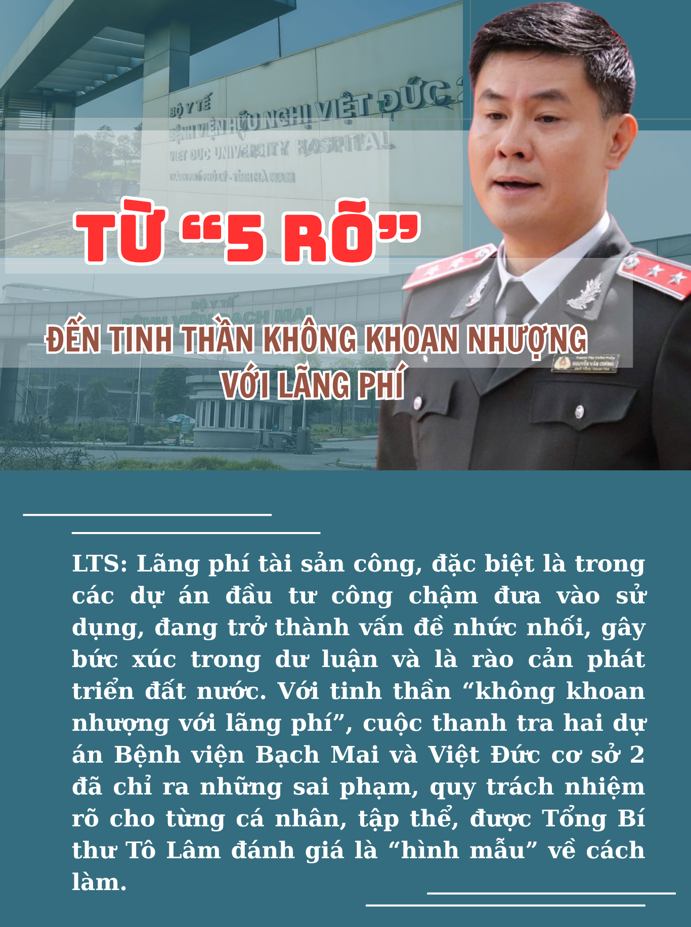 Thông thường, cơ quan thanh tra chỉ xác định các sai phạm và kiến nghị xử lý, còn lại trách nhiệm thuộc về ai và xử lý như thế nào lại không phải thẩm quyền của cơ quan thanh tra; điều đó dẫn đến tình trạng xử lý trách nhiệm đôi khi chưa tương xứng với những vi phạm đã phát hiện qua thanh tra. Vì vậy, quan điểm chỉ đạo của tôi với cuộc thanh tra này là phải làm rõ được nguyên nhân chính khiến 2 dự án bệnh viện chậm tiến độ, vi phạm, sai phạm xảy ra ở đâu, gây thiệt hại bao nhiêu, lãng phí ở mức độ nào và đặc biệt là phải xác định trách nhiệm cụ thể của từng cá nhân, tập thể đã gây ra những sai phạm này. Nhìn chung, đoàn thanh tra đã thực hiện tốt yêu cầu 5 rõ mà tôi đã đề ra.