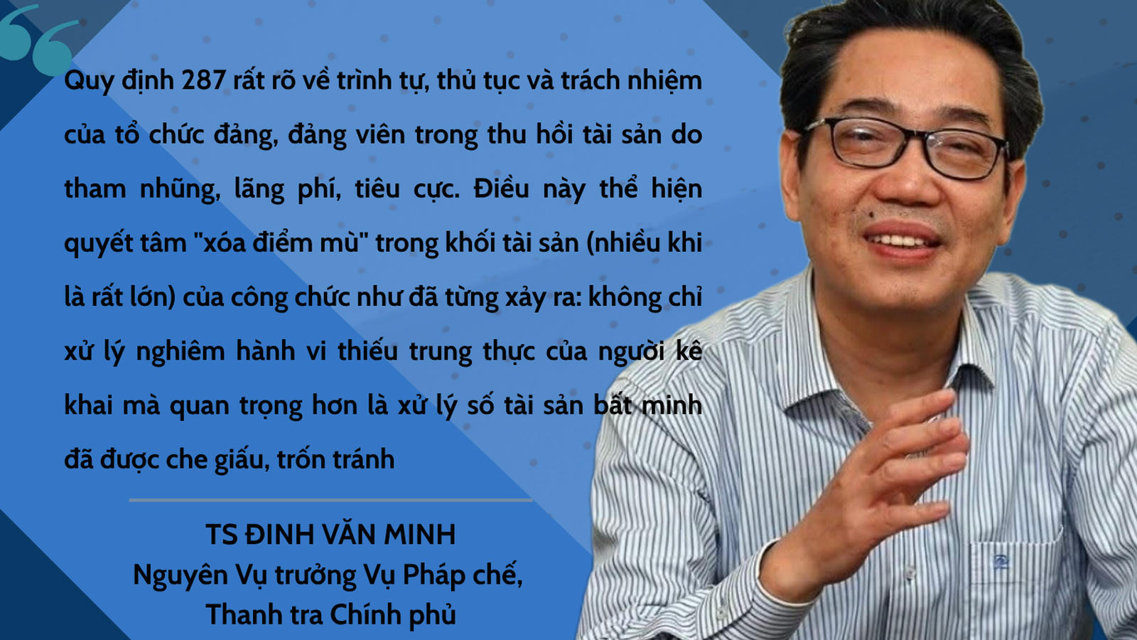 Theo TS Đinh Văn Minh, quy định này cho thấy Đảng không chỉ quyết liệt trong thu hồi tài sản tham nhũng mà còn đặt ra yêu cầu rất cụ thể, minh bạch về trách nhiệm phối hợp của tổ chức Đảng và đảng viên trong quá trình kiểm tra, giám sát, xử lý sai phạm. Việc yêu cầu cung cấp thông tin về tài sản của những người có quan hệ gia đình và các bên liên quan trực tiếp là bước tiến quan trọng, nhằm bóc tách, làm rõ nguồn gốc tài sản, ngăn chặn việc tẩu tán, che giấu hoặc hợp thức hóa tài sản tham nhũng. Điều này cũng thể hiện quyết tâm "xóa điểm mù" trong khối tài sản (nhiều khi là rất lớn) của công chức như đã từng xảy ra: Không chỉ xử lý nghiêm hành vi thiếu trung thực của người kê khai mà quan trọng hơn là xử lý số tài sản bất minh đã được che giấu, trốn tránh.