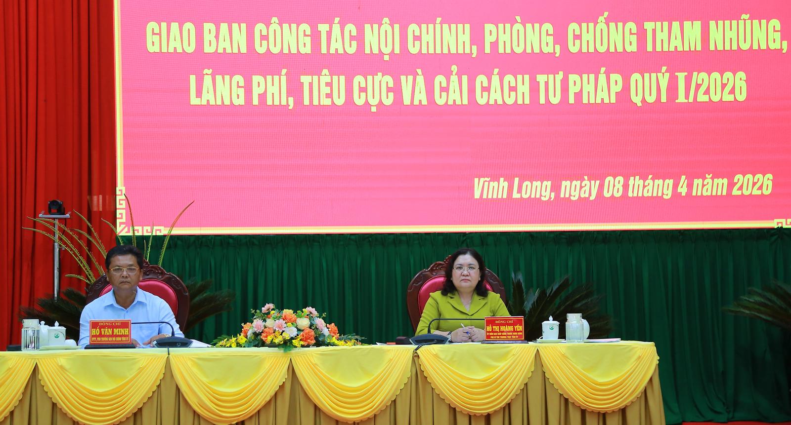 Bà Hồ Thị Hoàng Yến - Ủy viên Ban Chấp hành Trung ương Đảng, Phó Bí thư Thường trực Tỉnh ủy Vĩnh Long và ông Hồ Văn Minh - Ủy viên Ban Thường vụ Tỉnh ủy, Phó Trưởng Ban Thường trực Ban Nội chính Tỉnh ủy chủ trì hội nghị.
