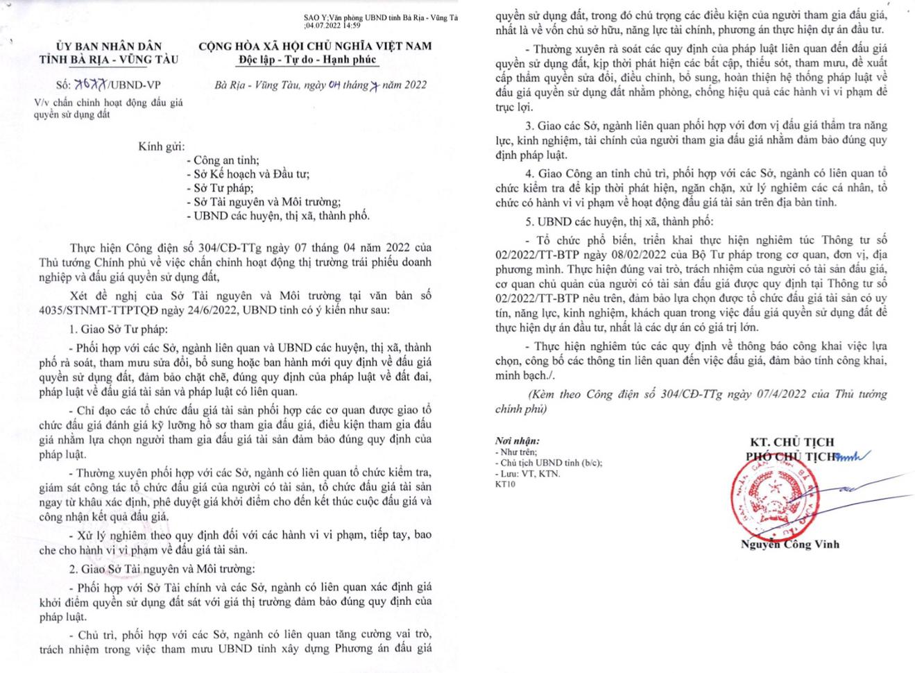 Công văn của UBND tỉnh Bà Rịa - Vũng Tàu. Ảnh: Trần Thọ
