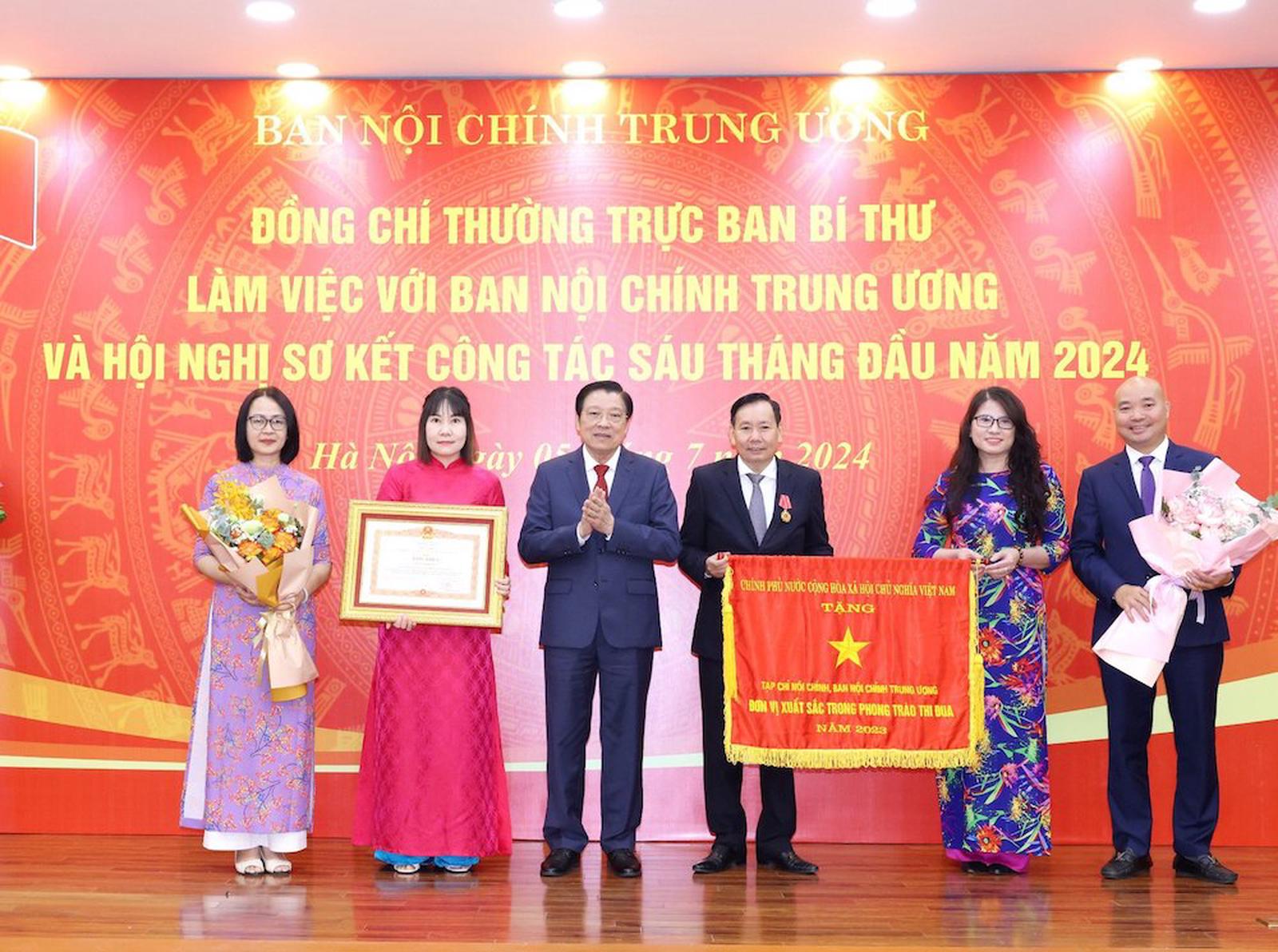 Tại hội nghị, Trưởng Ban Nội chính Trung ương Phan Đình Trạc trao Huân chương Lao động hạng Nhì cho ông Đàm Văn Lợi, nguyên Tổng Biên tập Tạp chí Nội chính và hạng Ba cho ông Nguyễn Tiến Dũng, nguyên Phó Vụ trưởng Vụ Địa phương I; trao Cờ Thi đua của Chính phủ tặng Tạp chí Nội chính, Ban Nội chính Trung ương đạt danh hiệu Đơn vị Xuất sắc trong phong trào thi đua năm 2023. Trưởng ban Nội chính Trung ương Phan Đình Trạc trao Cờ Thi đua của Chính phủ, Bằng khen của Thủ tướng cho tập thể và cá nhân cán bộ Tạp chí Nội chính. Ảnh: Đ.P Ông Phan Đình Trạc cũng trao Bằng khen của Thủ tướng Chính phủ tặng bà Bùi Thị Thu Huyền, Phó Tổng Biên tập Tạp chí Nội chính có nhiều thành tích trong công tác thông tin, tuyên truyền các hoạt động của Ban Chỉ đạo Trung ương về phòng, chống tham nhũng, tiêu cực và ngành Nội chính Đảng. Ông Võ Văn Dũng, Phó Trưởng ban Thường trực được trao Huy hiệu 40 năm tuổi Đảng tặng Đảng viên thuộc Ban Nội chính Trung ương.