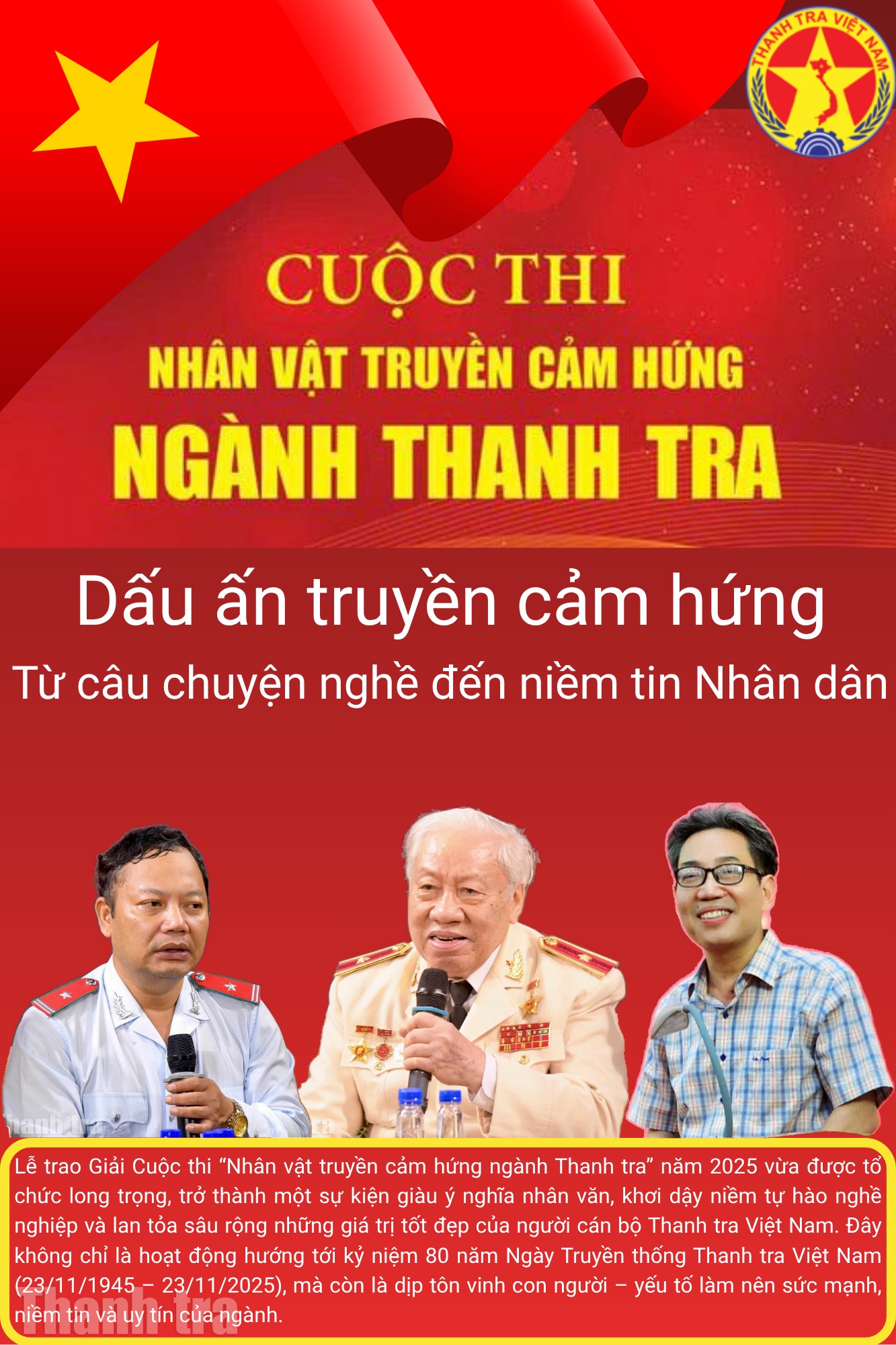 Cuộc thi “Nhân vật truyền cảm hứng ngành Thanh tra” do Thanh tra Chính phủ và Báo Thanh tra tổ chức, hướng tới kỷ niệm 80 năm Ngày truyền thống ngành Thanh tra Việt Nam (23/11/1945 - 23/11/2025). Cuộc thi đã góp phần tôn vinh những giá trị đẹp, lan tỏa niềm tự hào, tinh thần liêm chính và cống hiến trong toàn ngành. Ban Tổ chức Cuộc thi xin trân trọng cảm ơn sự đồng hành, ủng hộ quý báu của các đơn vị, doanh nghiệp: Tập đoàn Công nghiệp - Năng lượng Quốc gia Việt Nam (PVN); Công ty Tài chính Cổ phần Điện lực; Công ty Cổ phần Tập đoàn T&T; Ngân hàng TMCP Sài Gòn - Hà Nội (SHB); Công ty Cổ phần Tập đoàn Vàng bạc Đá quý DOJI; Tập đoàn Sunshine Group; Tổng Công ty Lọc - Hóa dầu Bình Sơn (BSR), Công ty Cổ phần Him Lam; Công ty Cổ phần Bất động sản Sơn Kim; Công ty Cổ phần Phân bón Miền Nam, Tổng Công ty Xi măng Việt Nam (VICEM)… Sự đồng hành của Quý đơn vị là nguồn động viên to lớn, góp phần quan trọng vào thành công của Cuộc thi, đồng thời thể hiện tinh thần trách nhiệm xã hội, chung tay cùng ngành Thanh tra lan tỏa những giá trị liêm chính, tận tụy và vì nhân dân phục vụ.