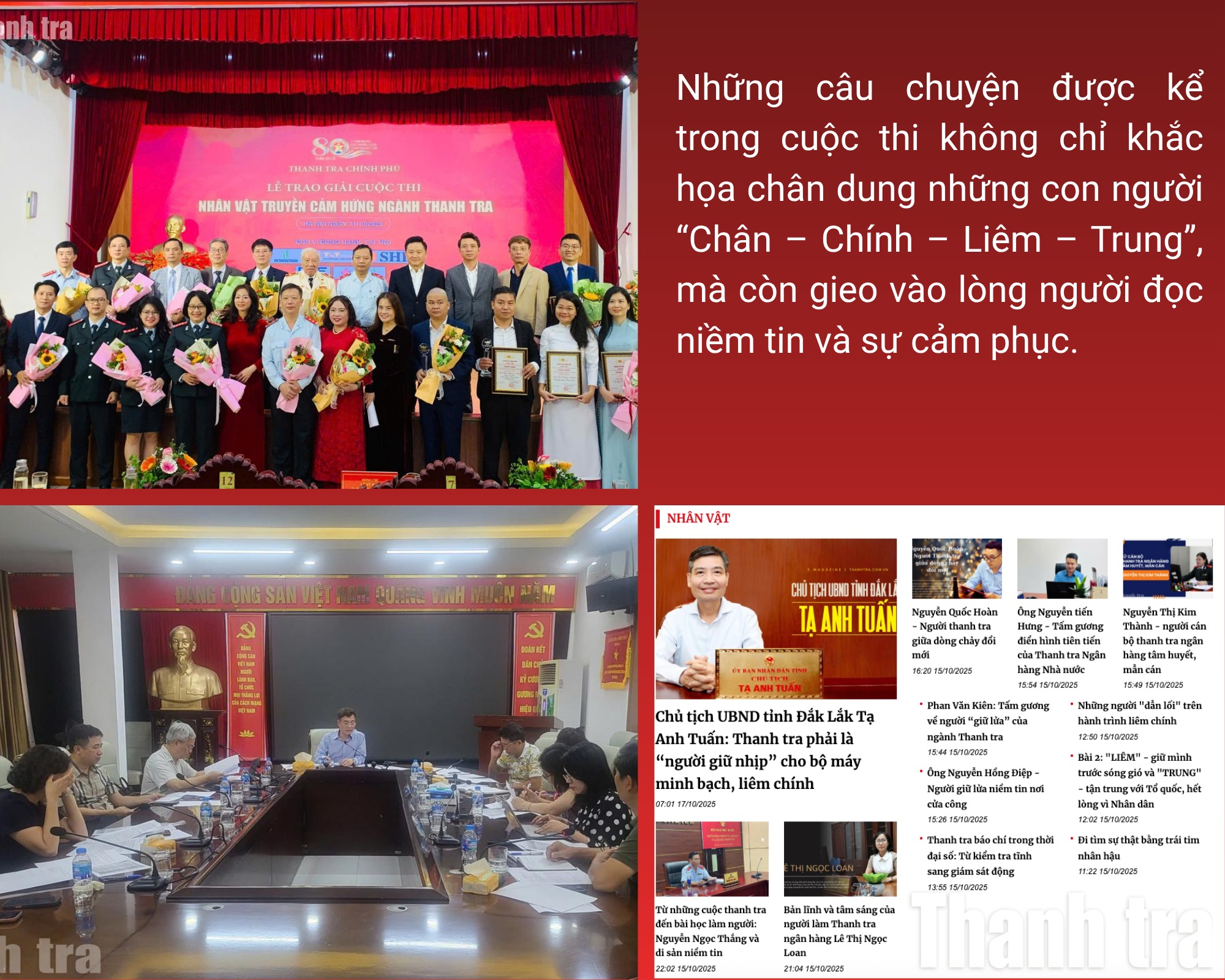Thành công của Cuộc thi “Nhân vật truyền cảm hứng ngành Thanh tra” không chỉ nằm ở những tác phẩm đoạt giải, mà quan trọng hơn, ở sức lan tỏa và hiệu ứng xã hội mà cuộc thi tạo ra. Người dân hiểu hơn về công việc thầm lặng, nhiều áp lực của những người làm công tác Thanh tra; đồng thời củng cố niềm tin vào sự công tâm, khách quan của cơ quan Thanh tra trong bảo vệ quyền lợi hợp pháp của Nhân dân.