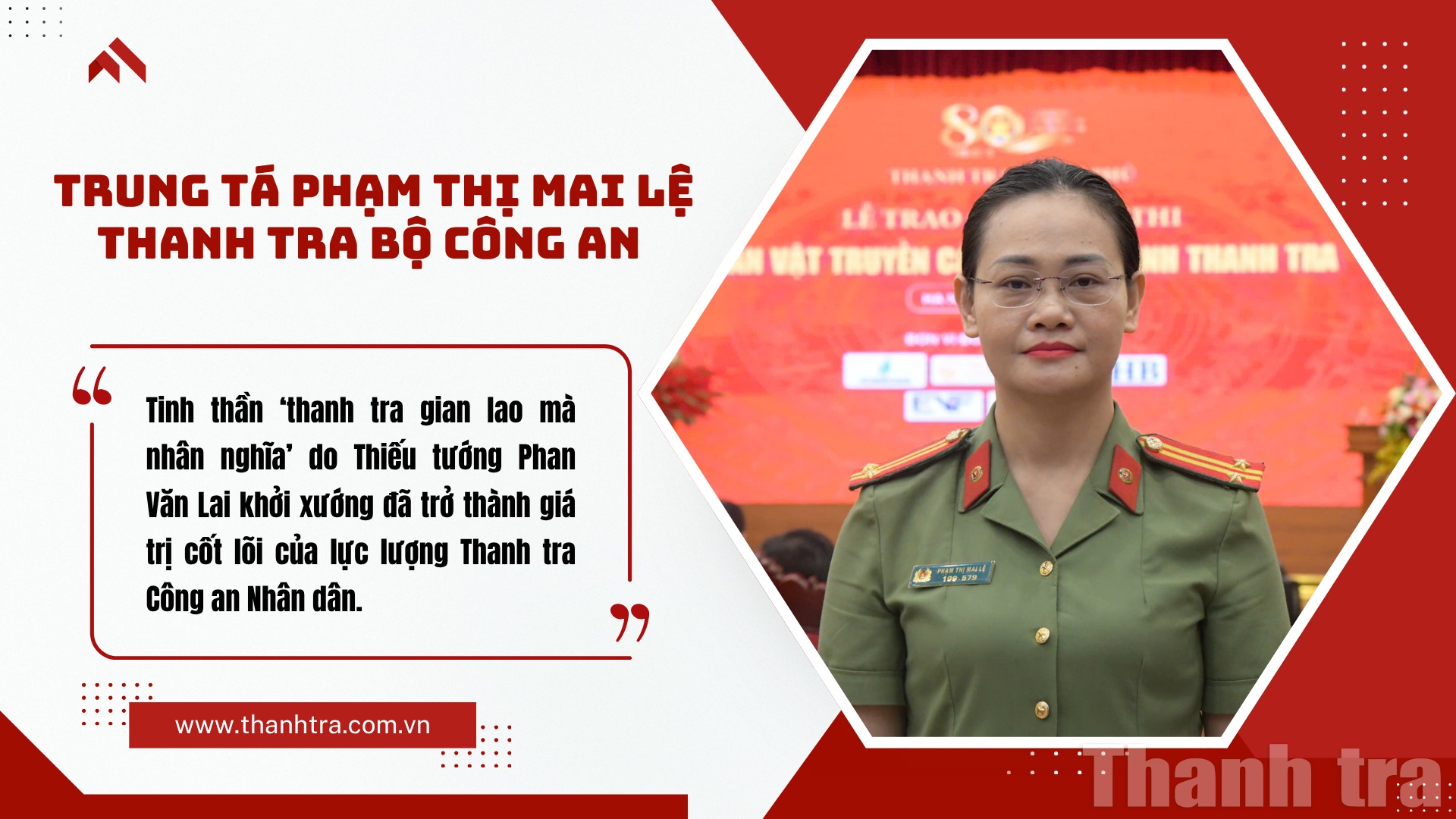 “Tinh thần ‘thanh tra gian lao mà nhân nghĩa’ do Thiếu tướng Phan Văn Lai khởi xướng đã trở thành giá trị cốt lõi của lực lượng Thanh tra Công an Nhân dân. Đó là triết lý nghề nghiệp đề cao bản lĩnh, liêm chính, thượng tôn pháp luật, thực thi công vụ bằng lương tâm và nhân nghĩa. Tinh thần ấy lan tỏa sâu rộng trong từng cán bộ, chiến sĩ Thanh tra Công an Nhân dân qua phong cách làm việc công tâm, khách quan, thấu tình, đạt lý; coi trọng đối thoại, hướng dẫn, ‘phòng ngừa là chính’. Nhờ thấm nhuần tinh thần ấy, các thế hệ thanh tra Công an Nhân dân đã xây dựng được hình ảnh người cán bộ thanh tra vừa kiên cường, công minh, vừa nhân ái, vị tha – biểu tượng cho văn hóa thanh tra Công an Nhân dân, nơi ‘kỷ luật và nhân văn song hành’,” Trung tá Phạm Mai Lệ nhấn mạnh.