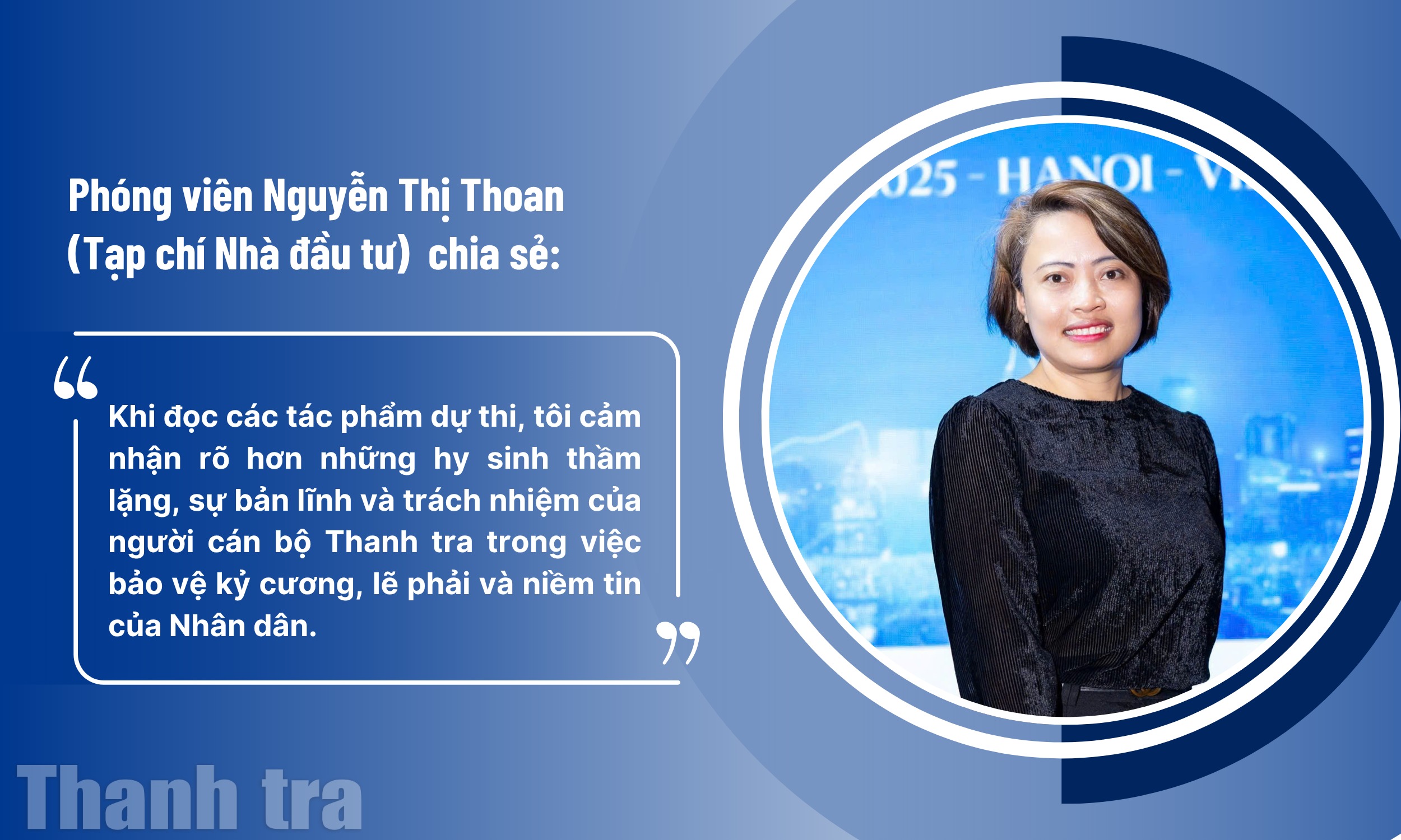 Phóng viên Nguyễn Thị Thoan (Tạp chí Nhà đầu tư) bày tỏ rằng Cuộc thi “Nhân vật truyền cảm hứng ngành Thanh tra” đã mang lại nhiều cảm xúc đặc biệt cho những người làm báo. “Khi đọc các tác phẩm dự thi, tôi cảm nhận rõ hơn những hy sinh thầm lặng, sự bản lĩnh và trách nhiệm của người cán bộ Thanh tra trong việc bảo vệ kỷ cương, lẽ phải và niềm tin của Nhân dân. Những câu chuyện dung dị mà giàu nhân văn ấy không chỉ truyền cảm hứng cho người trong ngành, mà còn chạm đến trái tim của công chúng, giúp xã hội hiểu hơn về một nghề cao quý, lặng lẽ nhưng vô cùng đáng trân trọng” – chị Thoan chia sẻ.