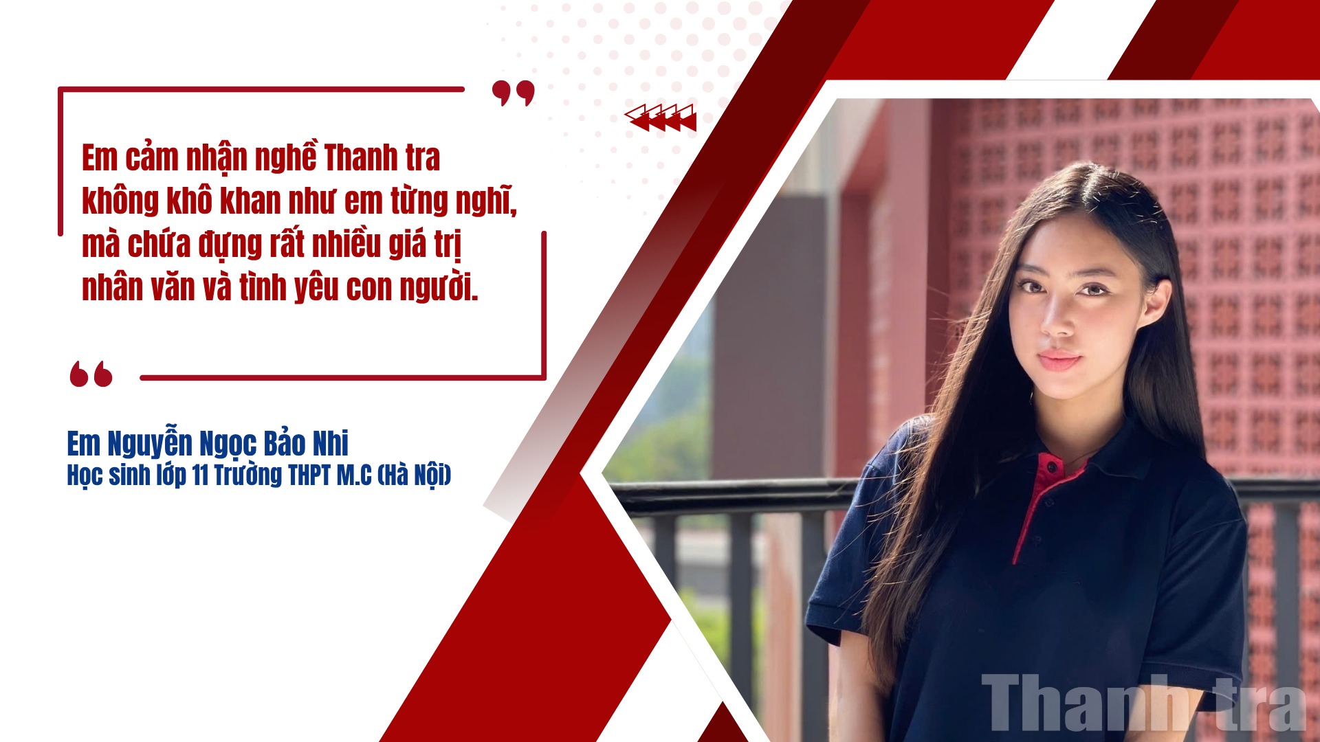 Bảo Nhi chia sẻ: “Khi viết về mẹ, em mới hiểu sâu hơn ý nghĩa công việc mà mẹ gắn bó. Đằng sau những bài báo, những chuyến công tác là biết bao nỗ lực, tâm huyết và niềm tin vào sự liêm chính, công bằng. Em cảm nhận nghề Thanh tra không khô khan như em từng nghĩ, mà chứa đựng rất nhiều giá trị nhân văn và tình yêu con người. Em tự hào về mẹ và về những người đang làm nghề cao quý này.”