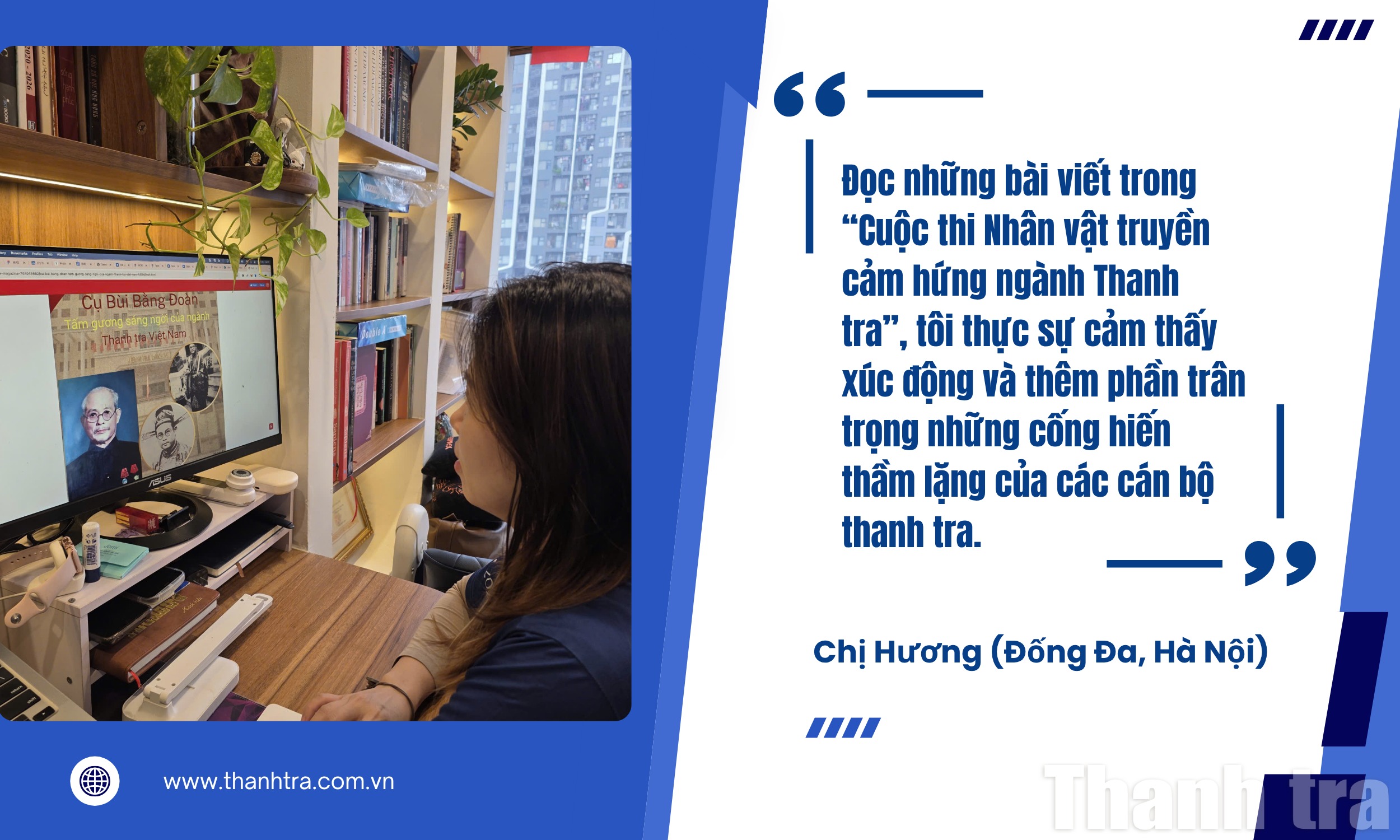 Những câu chuyện này giúp chúng tôi hiểu hơn về tinh thần 'Chân - Chính - Liêm - Trung' mà họ đang gìn giữ, về sự dũng cảm trong đấu tranh phòng chống tham nhũng, tiêu cực. Đây thực sự là những tấm gương sáng, tiếp thêm niềm tin cho Nhân dân. Cảm ơn Báo Thanh tra và Ban Tổ chức đã có một cuộc thi ý nghĩa để lan tỏa những giá trị tốt đẹp này."