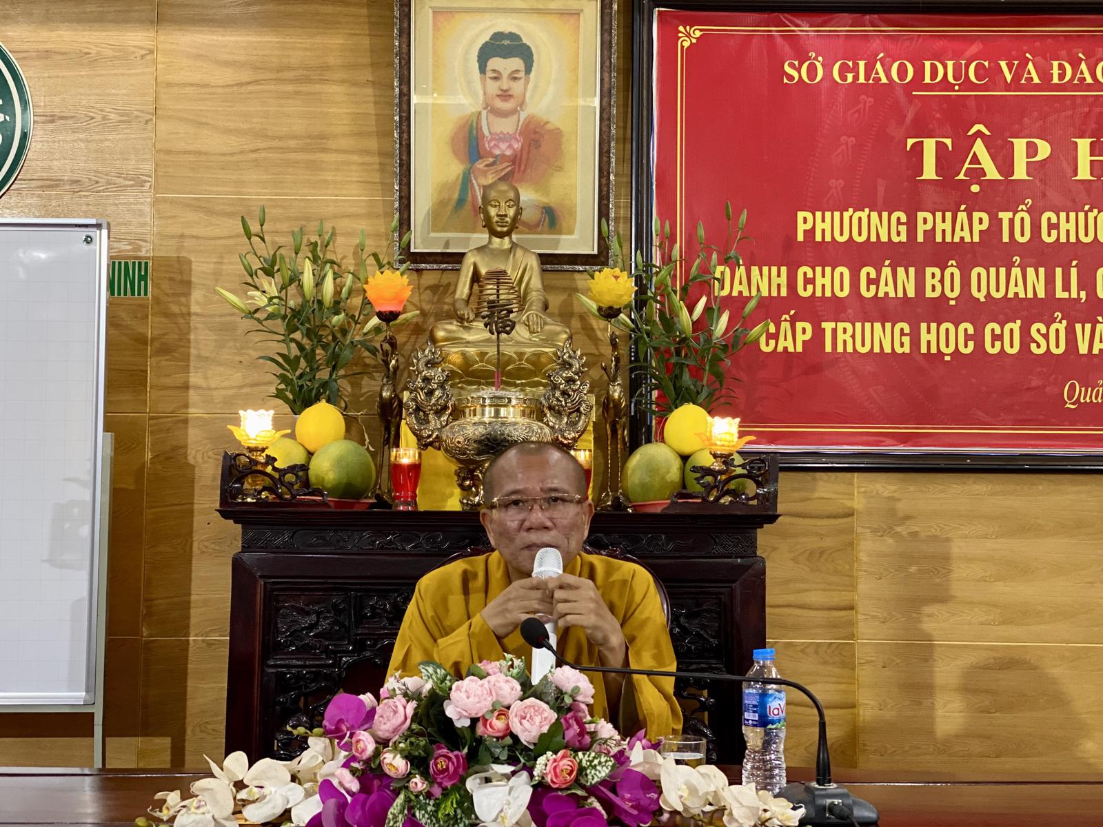 Thượng tọa Thích Đạo Hiển, Chánh Thư ký, Phó Ban Trị sự Phật giáo tỉnh thuyết giảng thời pháp thoại về chủ đề “Cuộc đời và sự nghiệp của Đức vua - Phật hoàng Trần Nhân Tông và những giá trị của Khu Di tích, danh thắng Yên Tử”, đồng thời, giới thiệu mở rộng thêm về các khu, cụm di tích liên quan trên địa bàn tỉnh cho 150 giáo viên tham dự.