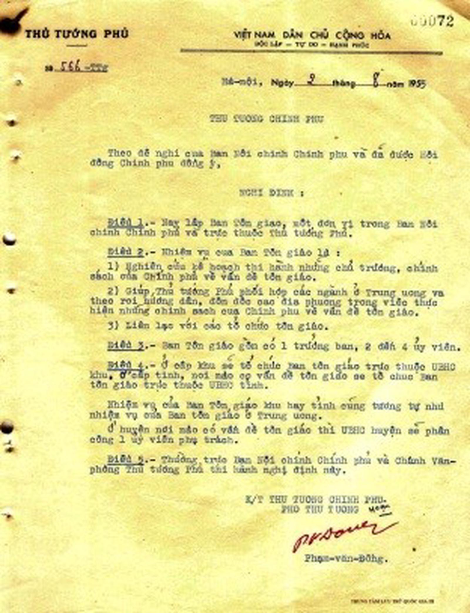 Nghị định số 566/TTg ngày 2/8/1955 của Thủ tướng Chính phủ nước Việt Nam Dân chủ Cộng hòa về việc thành lập Ban Tôn giáo trực thuộc Thủ tướng Phủ. Ảnh: BDT