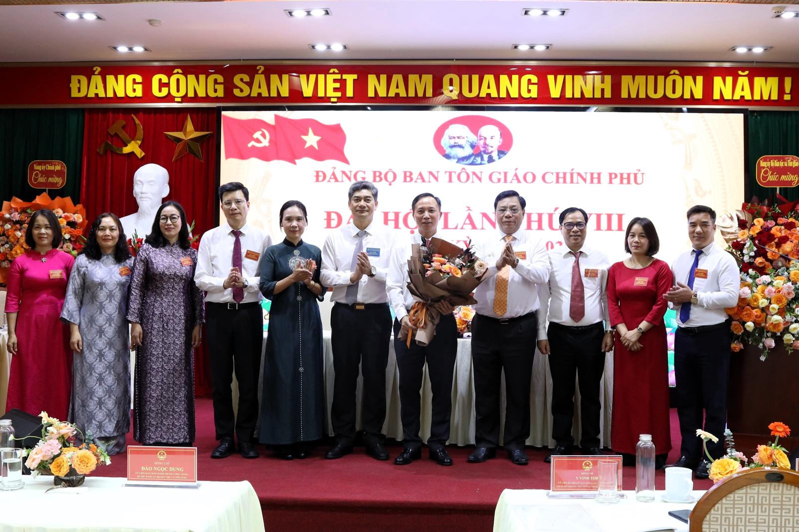 Phó Bí thư Thường trực Đảng ủy, Thứ trưởng Bộ Dân tộc và Tôn giáo Y Vinh Tơr và Thứ trưởng Bộ Dân tộc và Tôn giáo Nguyễn Hải Trung chúc mừng Ban Chấp hành Đảng bộ Ban Tôn giáo Chính phủ nhiệm kỳ 2025-2030. Ảnh: BDT
