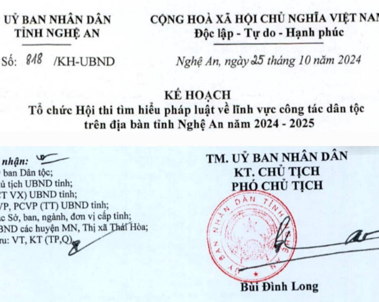 Tại Kế hoạch 818/KH- UBND ngày 25/10/2024 do ông Bùi Đình Long, Phó Chủ tịch UBND tỉnh Nghệ An ký ban hành kế hoạch tổ chức Hội thi tìm hiểu pháp luật về lĩnh vực công tác dân tộc trên địa bàn tỉnh năm 2024 - 2025, nhằm nâng cao nhận thức của các cấp, các ngành và Nhân dân trong việc thực hiện đường lối, chủ trương, chính sách của Đảng và pháp luật của Nhà nước về lĩnh vực công tác dân tộc, đẩy mạnh việc tìm hiểu pháp luật bằng hình thức sân khấu hóa, phù hợp với phong tục tập quán, văn hóa truyền thống vùng dân tộc thiểu số và miền núi.