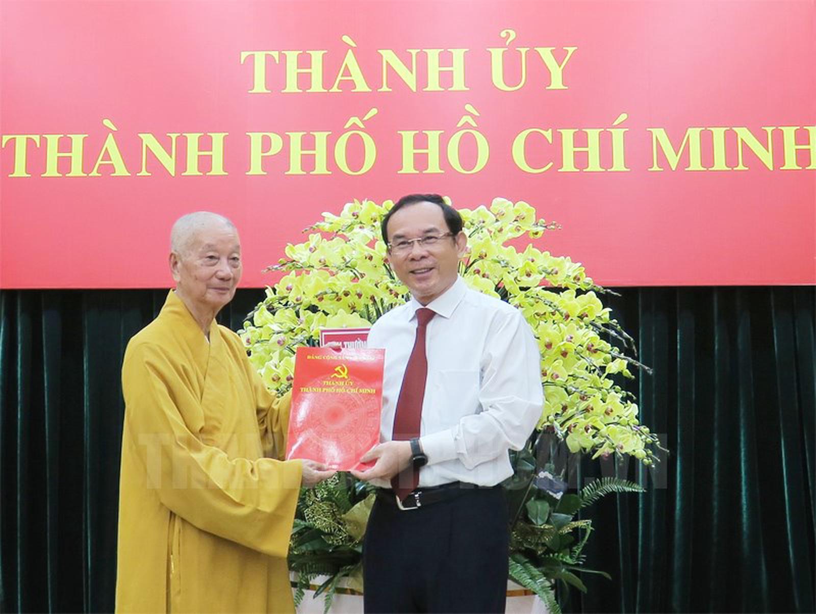 Hòa thượng Thích Trí Quảng cùng đại diện đoàn tặng hoa lãnh đạo TP. Ảnh: Thành ủy HCM