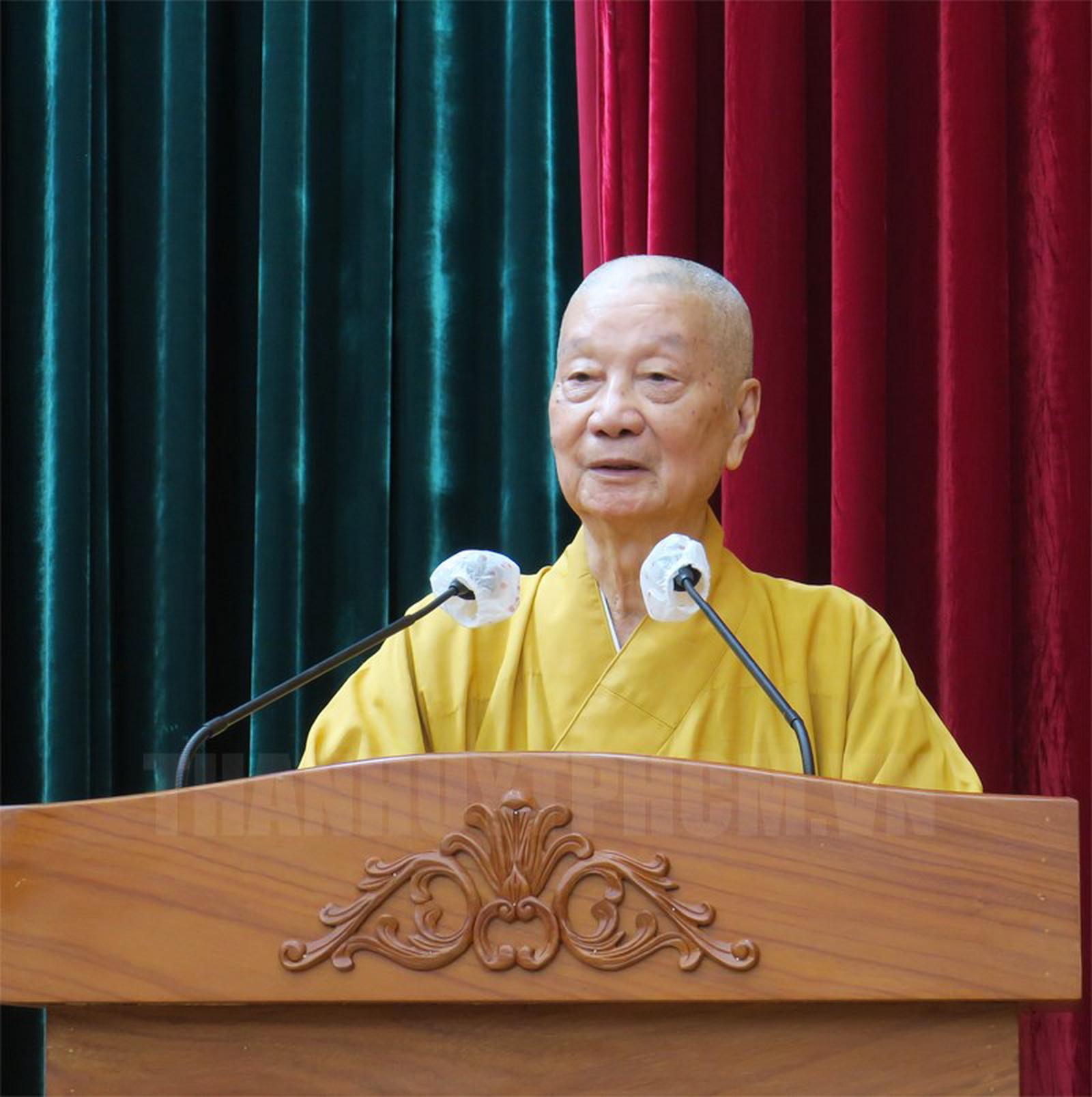 Hòa thượng Thích Trí Quảng, quyền Pháp chủ Hội đồng Chứng minh GHPG Việt Nam phát biểu. Ảnh: Thành ủy HCM