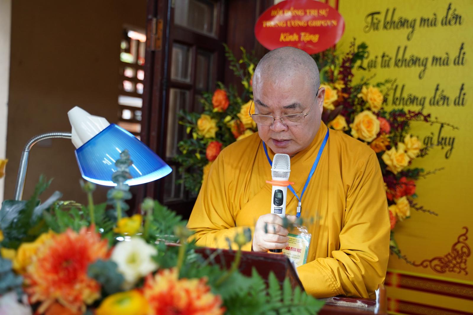Hoà thượng Thích Gia Quang - Phó Chủ tịch Hội đồng Trị sự, Viện trưởng Phân viện Nghiên cứu Phật học Việt Nam tại Hà Nội, trụ trì chùa Liên Phái phát biểu khai mạc hội thảo. Ảnh: TV