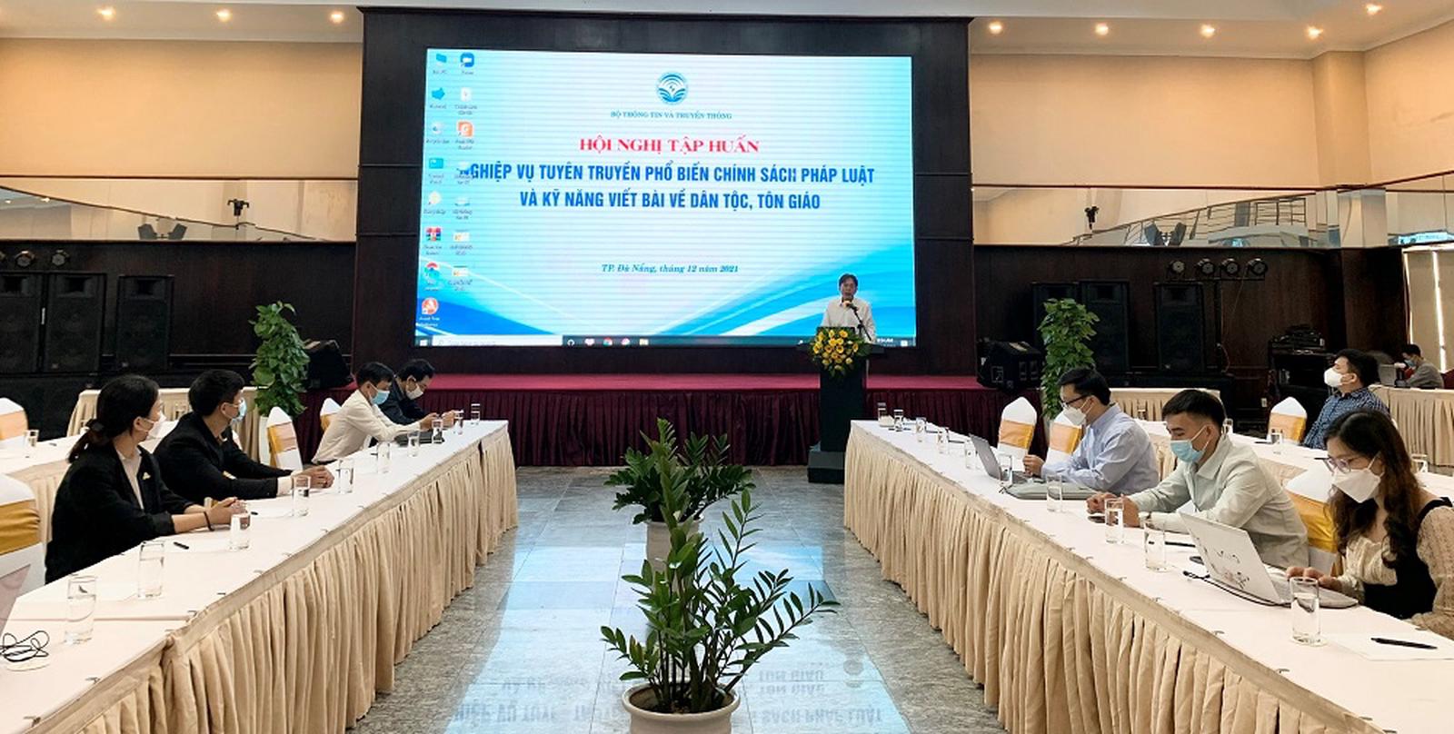 Sáng cùng ngày, tại Đà Nẵng, Bộ TT&TT cũng đã tổ chức hội nghị tập huấn nghiệp vụ tuyên truyền phổ biến pháp luật và kỹ năng viết bài về dân tộc, tôn giáo cho các báo cáo viên là công chức, viên chức làm công tác văn hóa thông tin và phóng viên, biên tập viên các báo, đài Trung ương và địa phương đóng tại miền Trung…