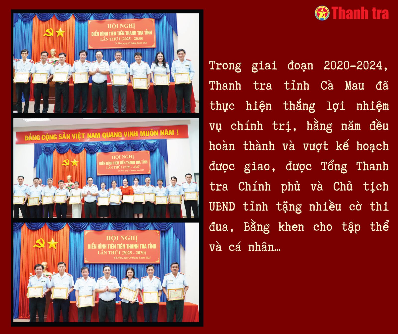 Trong 5 năm (2020 - 2024), Đảng ủy và lãnh đạo Thanh tra tỉnh Cà Mau đã quan tâm chỉ đạo, quán triệt, tổ chức triển khai thực hiện nghiêm túc các chủ trương của Đảng, chính sách pháp luật của Nhà nước về công tác thi đua, khen thưởng. Đơn vị đã tổ chức tuyên truyền, phổ biến sâu rộng các văn bản quy định về thi đua, khen thưởng, nhất là Luật Thi đua, khen thưởng và các Nghị định hướng dẫn thi hành, đến toàn thể công chức và người lao động để mọi người nắm vững và thực hiện theo quy định.