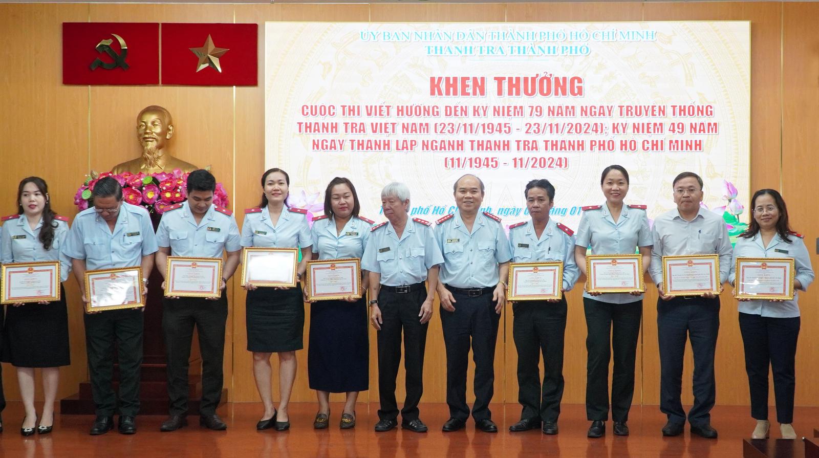 Thanh tra Thành phố Hồ Chí Minh khen thưởng Cuộc thi viết Hướng đến kỷ niệm 79 năm Ngày Truyền thống Thanh tra Việt Nam (23/11/1945 - 23/11/2024); kỷ niệm 49 năm Ngày Thành lập ngành Thanh tra thành phố. Ảnh: CN