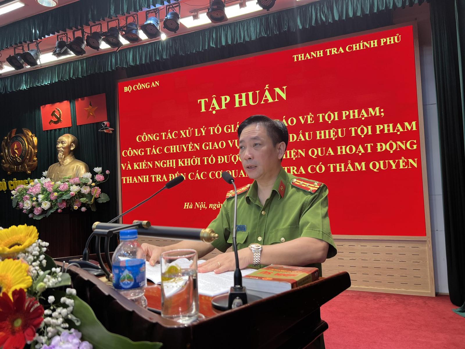 Đại tá Nguyễn Minh Tuấn, Phó Chánh Văn phòng Cơ quan Cảnh sát điều tra, Bộ Công an trình bày chuyên đề tại buổi tập huấn. Ảnh: Hoàng Long