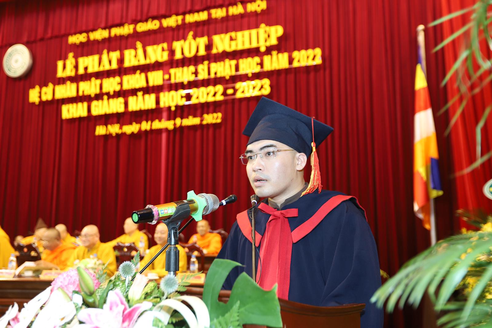 Đại đức Thích Thanh Thức, đại diện tăng ni sinh hệ cử nhân Phật học khóa VIII đã bày tỏ lòng tri ân đến chư tôn đức trong Hội đồng Điều hành, thầy cô giảng sư.