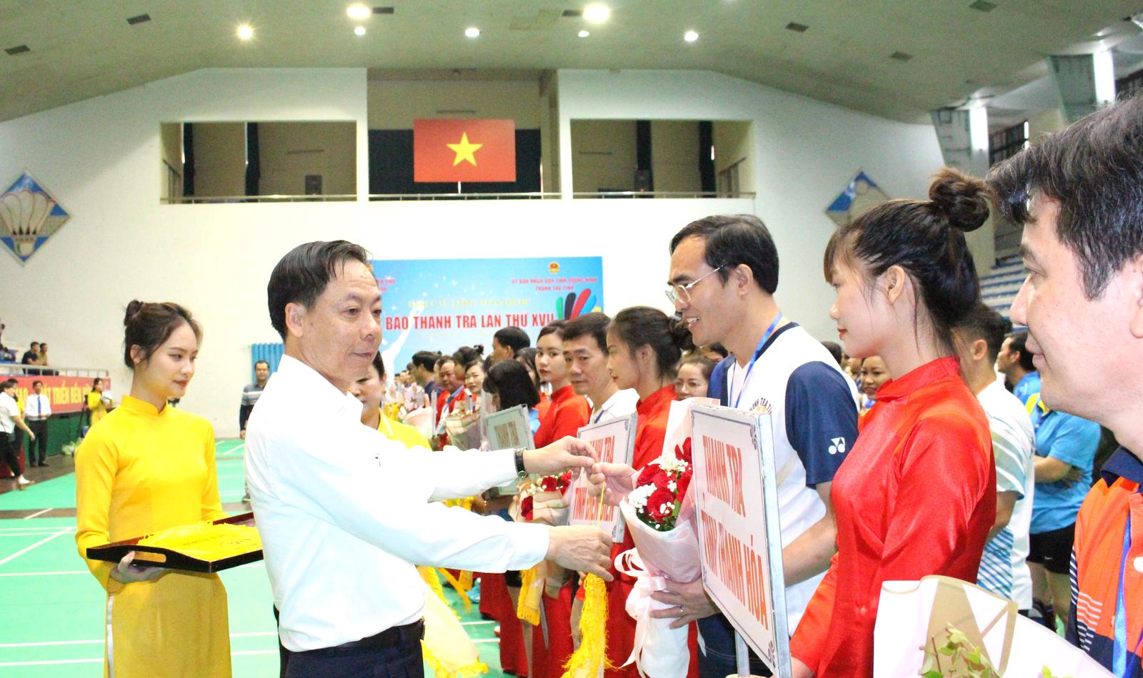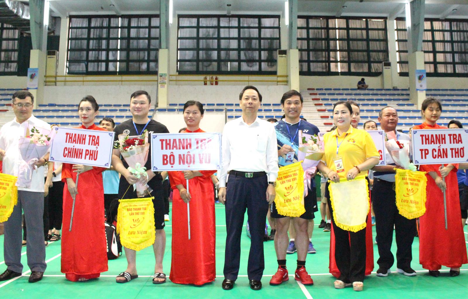 Phó Tổng Thanh tra Chính phủ Trần Ngọc Liêm tặng cờ cho các đoàn tham gia thi đấu. Ảnh: Trọng Tài