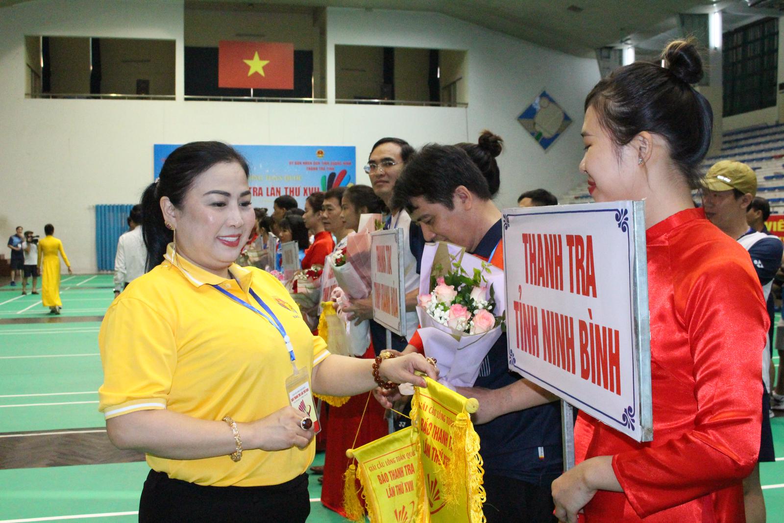 Phó Tổng Biên tập phụ trách Báo Thanh tra, Trưởng Ban Tổ chức Nguyễn Thị Hoa tặng cờ cho các đoàn tham gia thi đấu. Ảnh: Trọng Tài