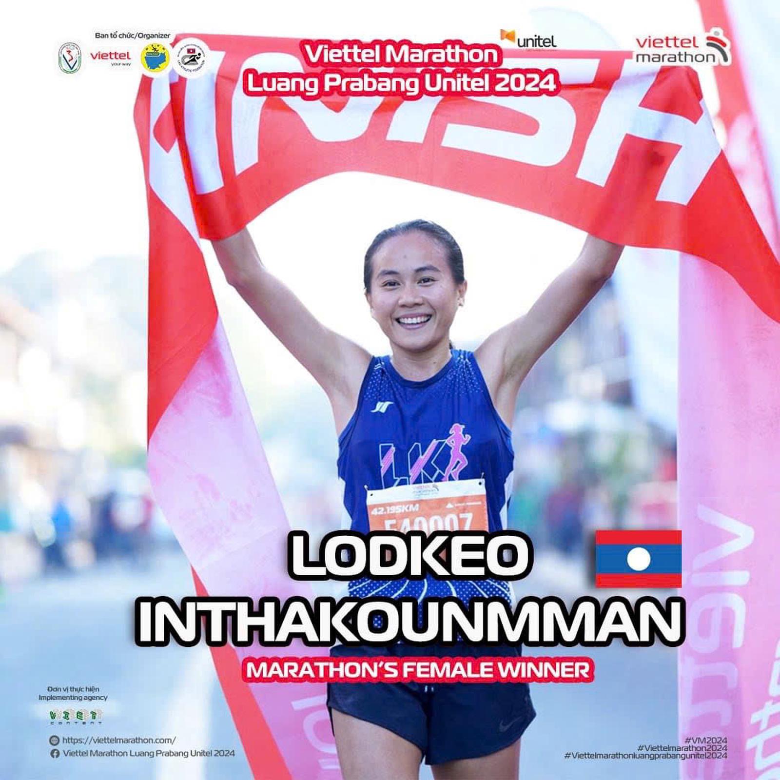Lodkeo Inthakounmman từng tham dự giải Bán Marathon Quốc tế Việt Nam tổ chức ở Hà Nội hôm 1/1/2024 và giành hạng 4 ở cự ly 21km. Cô chia sẻ sau cuộc đua hôm nay: “Tôi rất vui khi lần đầu tiên chinh phục cự ly 42km tại một giải chạy ở quê nhà. Tôi đã nỗ lực hết sức để vượt qua chính mình và rất hạnh phúc khi đã giành chiến thắng”.