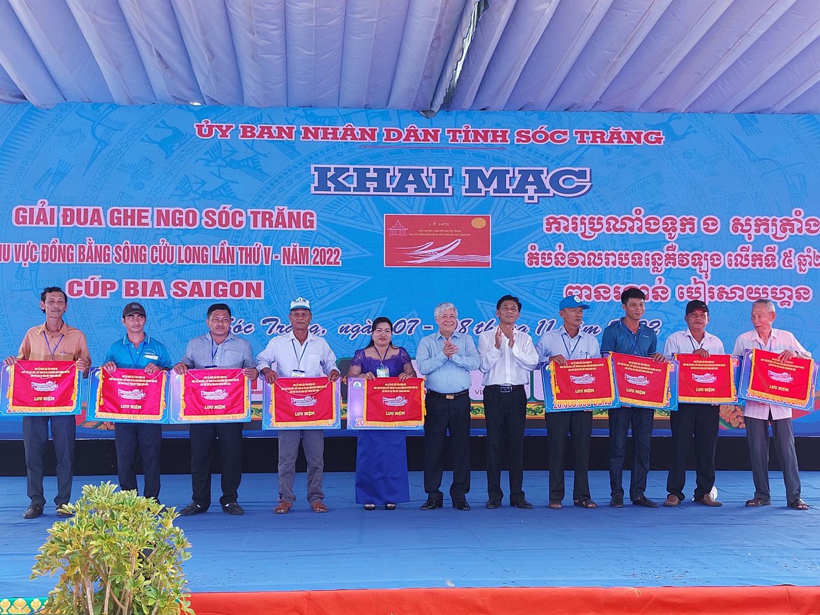 Chủ tịch Ủy ban Trung ương Mặt trận Tổ quốc Việt Nam Đỗ Văn Chiến và Bí thư Tỉnh ủy Sóc Trăng Lâm Văn Mẫn tặng cờ lưu niệm cho các đội ghe Ngo. Ảnh: XC