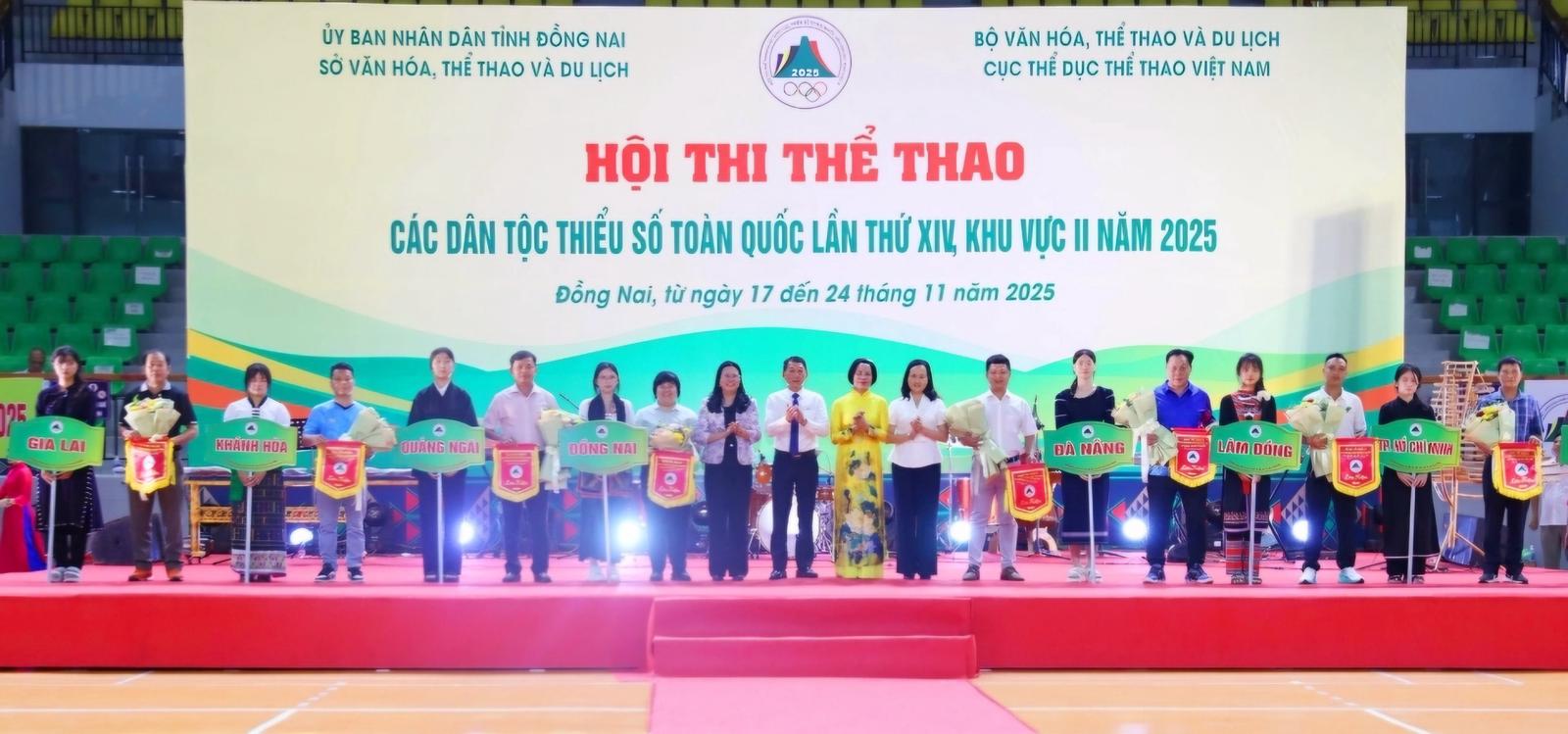 Hội thi Thể thao các dân tộc thiểu số toàn quốc lần thứ XIV, khu vực II năm 2025 tại Đồng Nai quy tụ gần 600 vận động viên của 8 tỉnh, thành từ Đà Nẵng trở vào, tranh tài ở 8 môn thể thao đặc trưng: Việt dã, chạy cà kheo, đẩy gậy, kéo co, bóng chuyền, bóng đá 7 người, bắn nỏ và bắn ná.