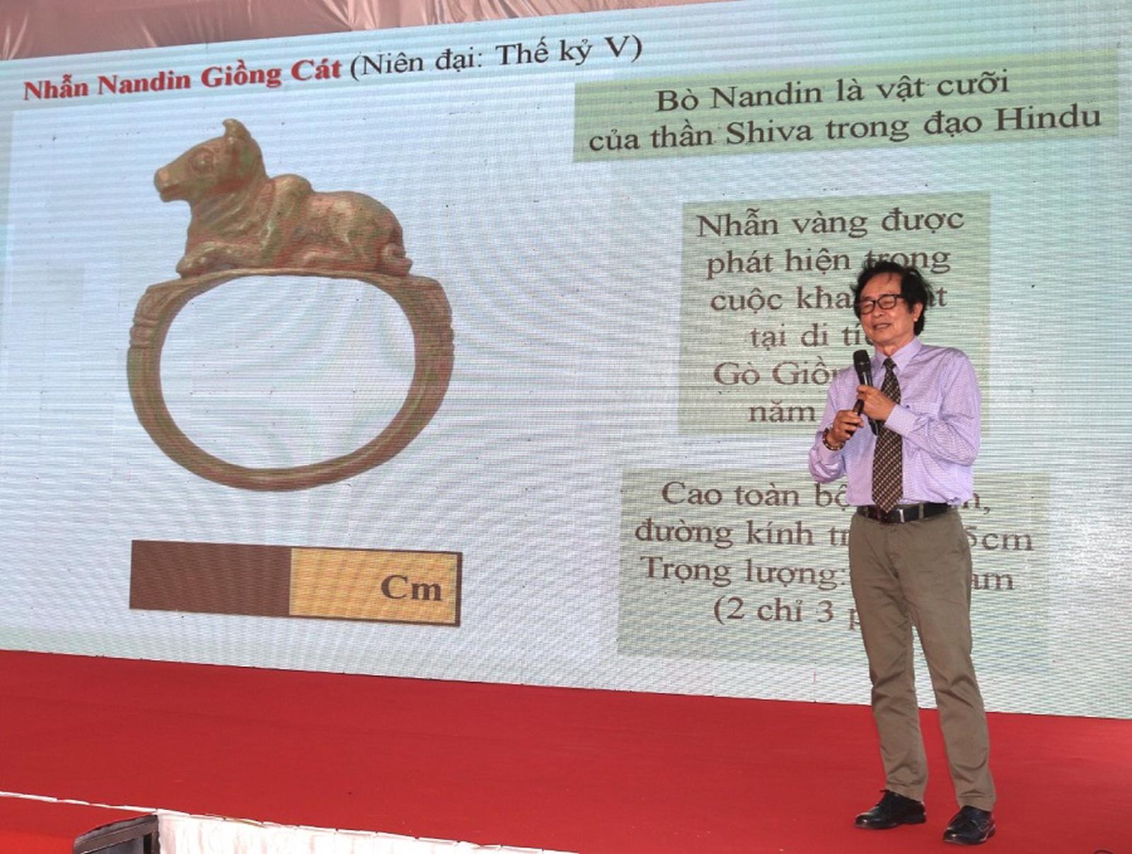 PGS. TS Đặng Văn Thắng giới thiệu 2 bảo vật quốc gia. Nguồn ảnh: angiang.gov.vn