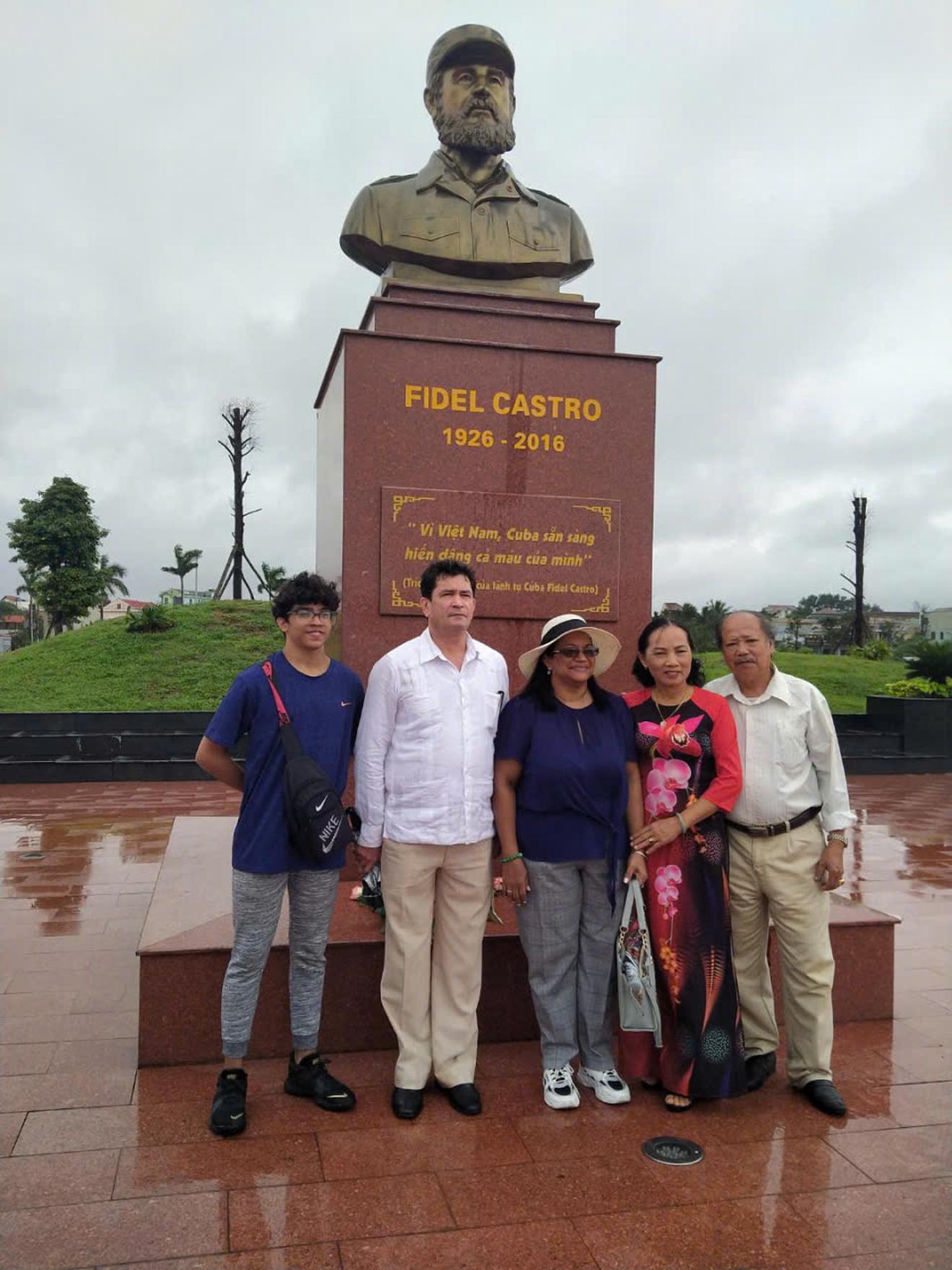Vợ chồng bà Hương và những người bạn Cuba bên tượng của lãnh tụ Fidel Castro tại Quảng Trị. Ảnh: Nhân vật cung cấp