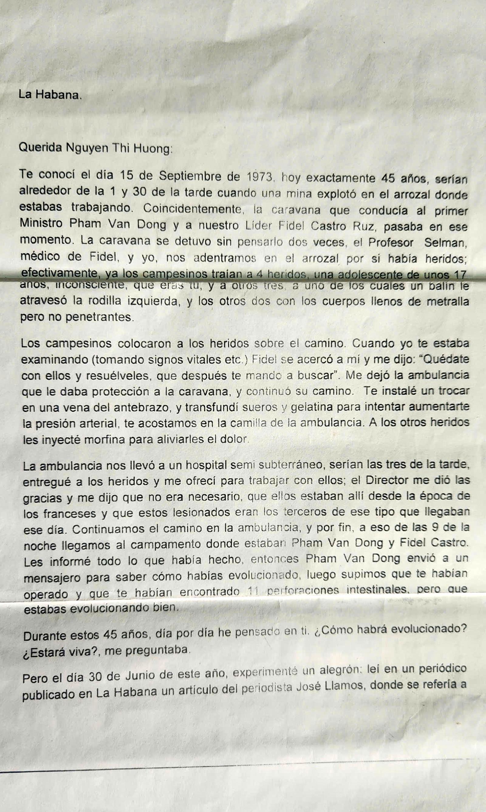 Năm 2018, cô dân công nhỏ năm nào bất ngờ nhận được bức thư từ Thủ đô La Habana của bác sĩ Ariel Soler Munoz. Trong thư, bác sĩ Ariel Soler Munoz chia sẻ ký ức về giai đoạn đó: Khi phát hiện những người bị thương, trong đó có chị Hương: “…tôi cùng Giáo sư Sleman (bác sĩ của Chủ tịch Fidel) xuống xe đi về phía cánh đồng nơi những người bị thương được đưa ra, trong đó có cô gái trẻ tầm 17 tuổi khi đó bị ngất, là chị. Khi tôi đang thực hiện việc khám nghiệm xem tình hình sức khỏe của chị như thế nào. Fidel đến và nói với tôi: “Anh hãy ở lại để xử lý giúp họ đi, tôi sẽ cho đến đón anh sau”. Ông đã để lại xe cứu thương có nhiệm vụ cấp cứu cho đoàn lãnh đạo Cuba và tiếp tục lên đường”.