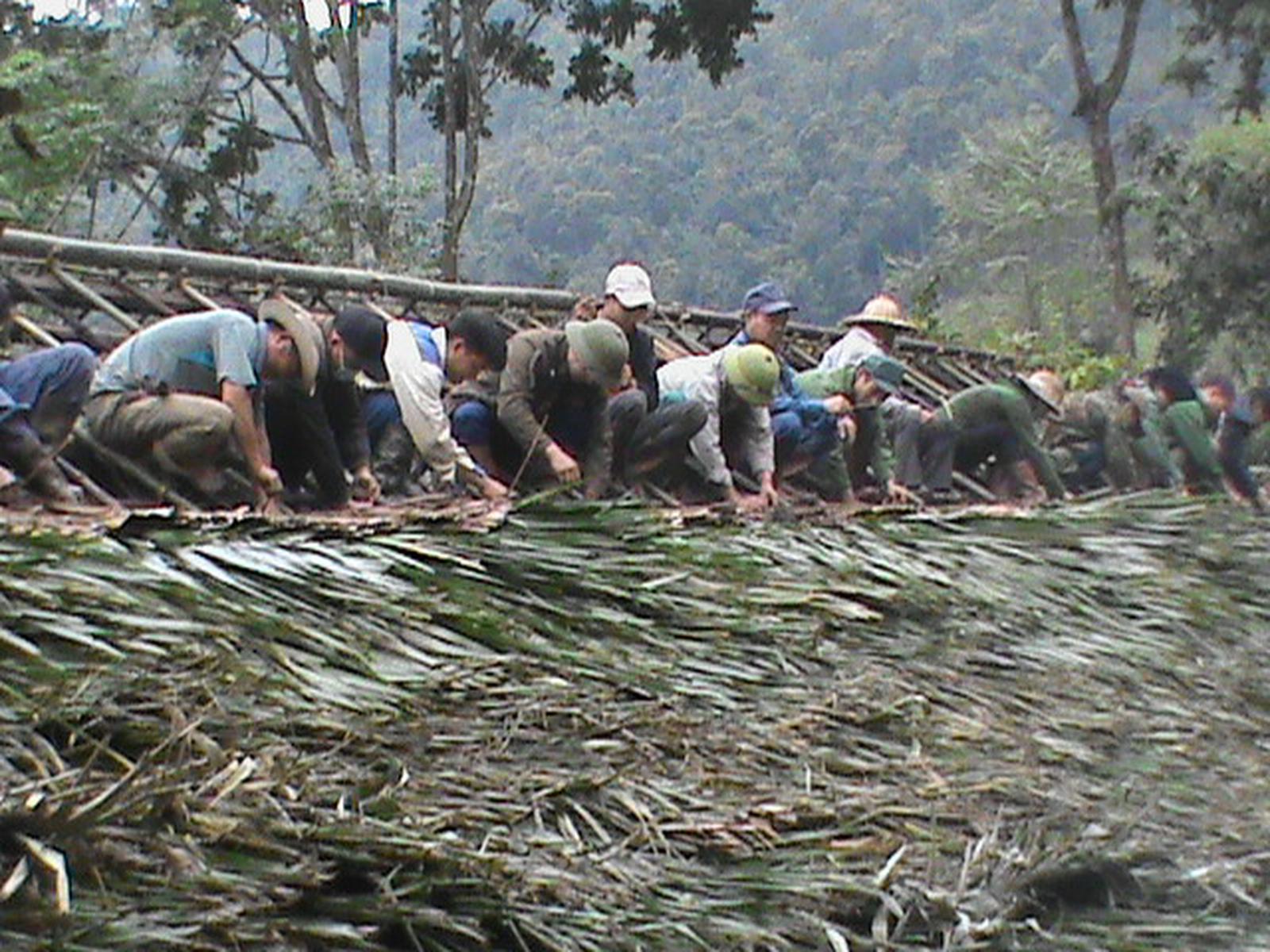 Để bảo tồn nhà truyền thống, người Dao Tiền bản Sưng vẫn lợp nhà bằng lá cọ. Mỗi khi lợp lại nhà, các hộ trong bản đóng góp lá cọ, ngày công giúp chủ hộ. Đây là nét đẹp trong đời sống sinh hoạt của người Dao Tiền bản Sưng. Ảnh: TH
