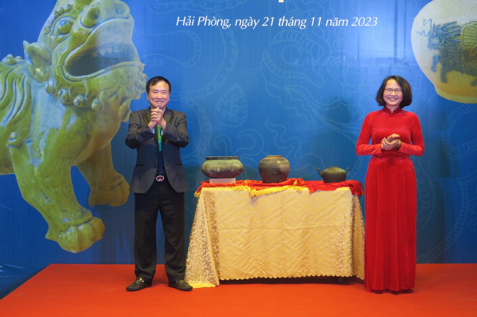 Chủ tịch Hội Cổ vật Hải Phòng Phạm Hiệp trao tặng Bảo tàng Hải Phòng một số cổ vật. Ảnh: KT