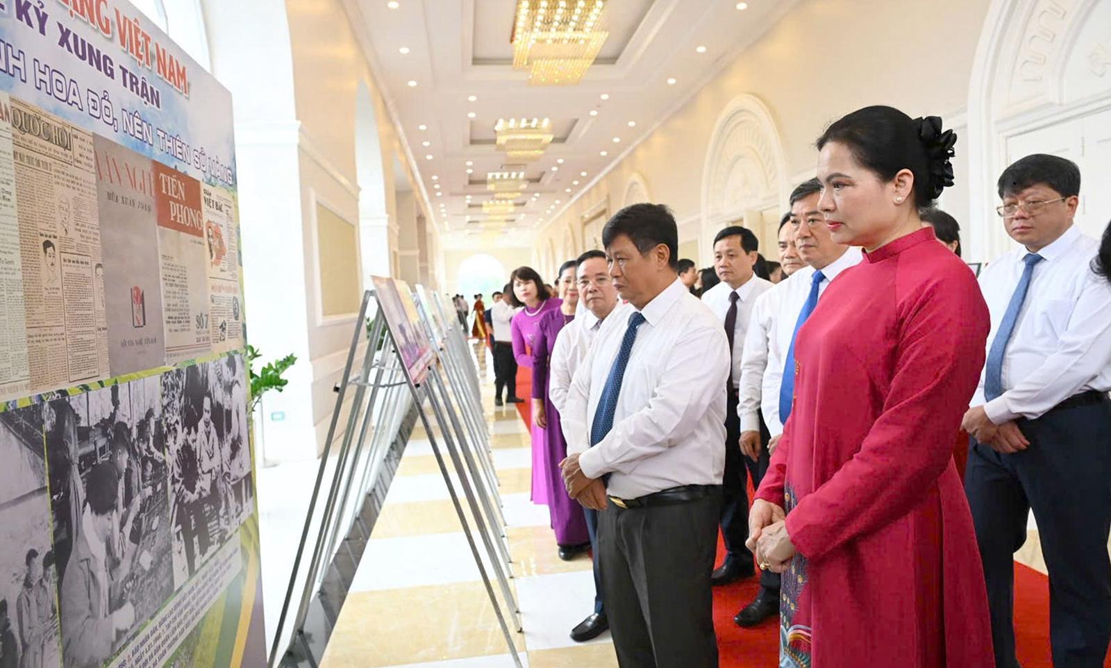 Bí thư Tỉnh ủy Tuyên Quang Hà Thị Nga cùng các đại biểu đang xem triển lãm ảnh báo chí Tuyên Quang tại gian trưng bày. Ảnh: ND