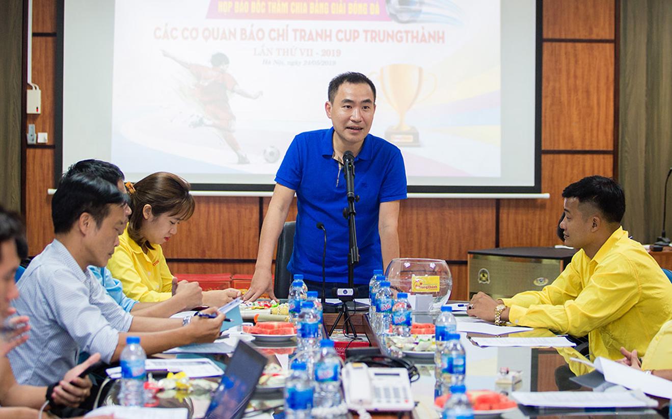 Ông Phạm Quốc Huy, Phó tổng biên tập Báo Đời sống & Pháp luật, Trưởng Ban tổ chức Giải bóng đá các cơ quan thông tấn báo chí lần thứ VII phát biểu tại buổi lễ họp báo, bốc thăm chia bảng. Ảnh: HT