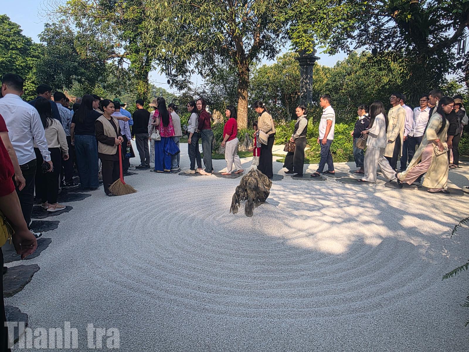 Nhiều bạn trẻ và các gia đình đã dành thời gian đi dạo trên những lớp sỏi mịn, ngắm nhìn 12 vòng tròn vẽ trên nền sỏi trước khu Tổ đường – biểu tượng cho 12 nhân duyên của con người, để cầu mong một năm mới vạn sự hanh thông.