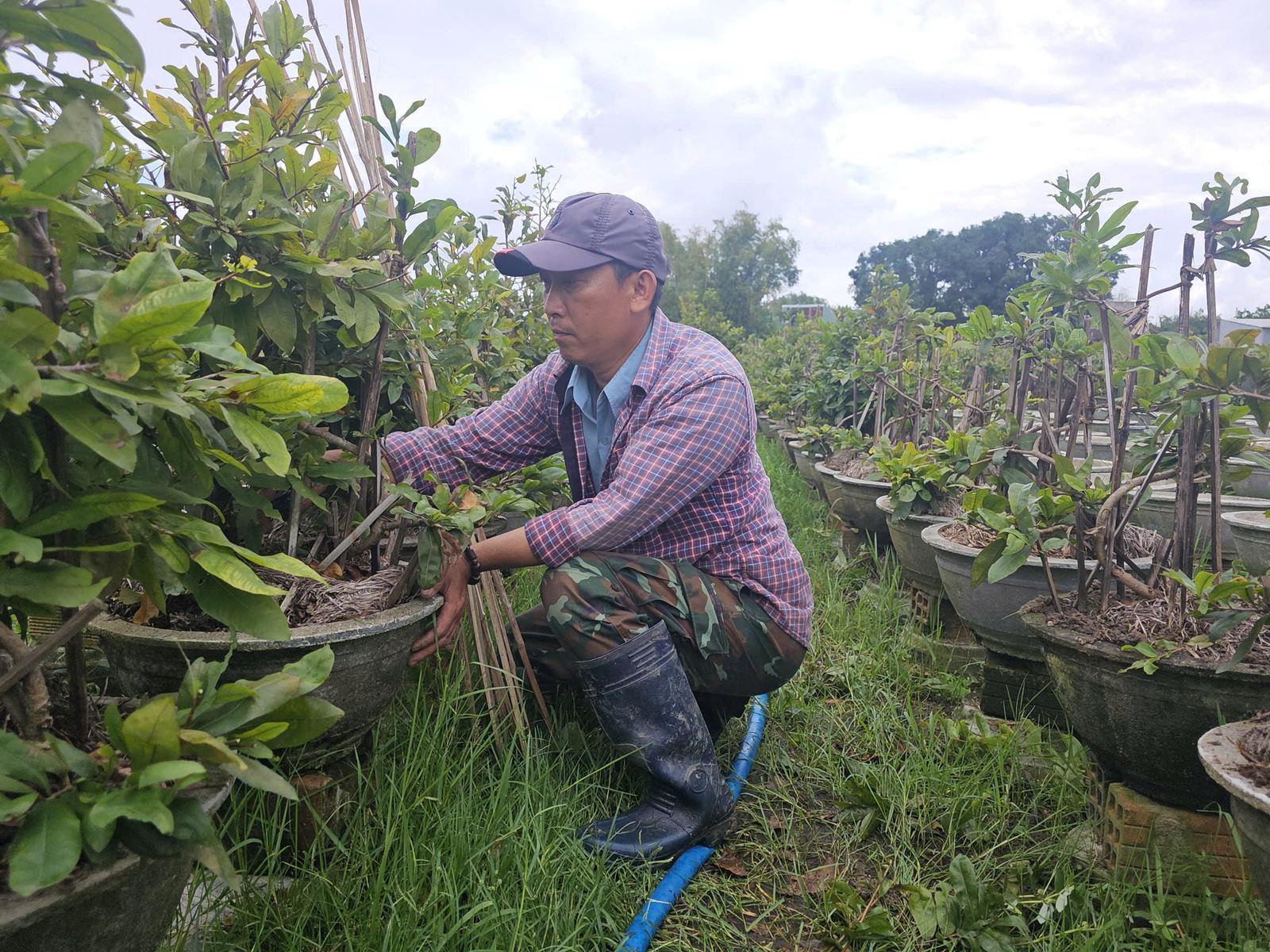 Ngoài việc nuôi gà siêu trứng, trồng cây ăn quả thì ông Lê Văn Luận (70 tuổi, ở thôn Thiết Trụ, xã Nhơn Hậu, thị xã An Nhơn) còn trồng chăm sóc hơn 1.000 chậu mai mi ni hữu cơ để bán trong dịp Tết đến. Đây là năm thứ hai ông chơi mai mi ni được bón bằng phân chuồng hữu cơ và giảm bơm thuốc trừ sâu độc hại để đảm bảo sức khỏe cho người trồng và chơi mai cảnh.