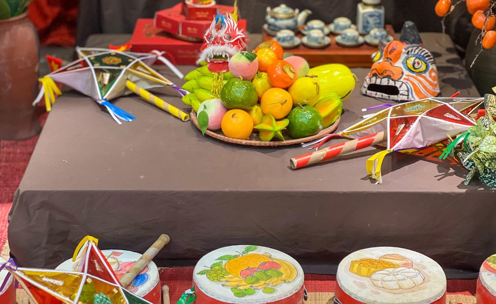 “Vui tết Trung Thu” 2025 tại Hoàng thành Thăng Long hấp dẫn với mâm ngũ quả cúng Tết Trung thu giản dị và không thể thiếu là những chiếc đèn ông sao, mặt nạ đầu lân, trống bỏi...